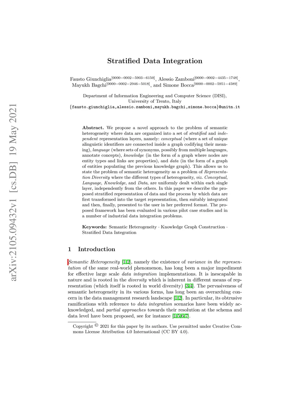 We propose a novel approach to the problem of semantic heterogeneity where data are organized into a set of stratified and independent representation layers, namely: conceptual(where a set of unique alinguistic identifiers are connected inside a graph codifying their meaning), language(where sets of synonyms, possibly from multiple languages, annotate concepts), knowledge(in the form of a graph where nodes are entity types and links are properties), and data(in the form of a graph of entities populating the previous knowledge graph). This allows us to state the problem of semantic heterogeneity as a problem of Representation Diversity where the different types of heterogeneity, viz. Conceptual, Language, Knowledge, and Data, are uniformly dealt within each single layer, independently from the others. In this paper we describe the proposed stratified representation of data and the process by which data are first transformed into the target representation, then suitably integrated and then, finally, presented to the user in her preferred format. The proposed framework has been evaluated in various pilot case studies and in a number of industrial data integration problems.