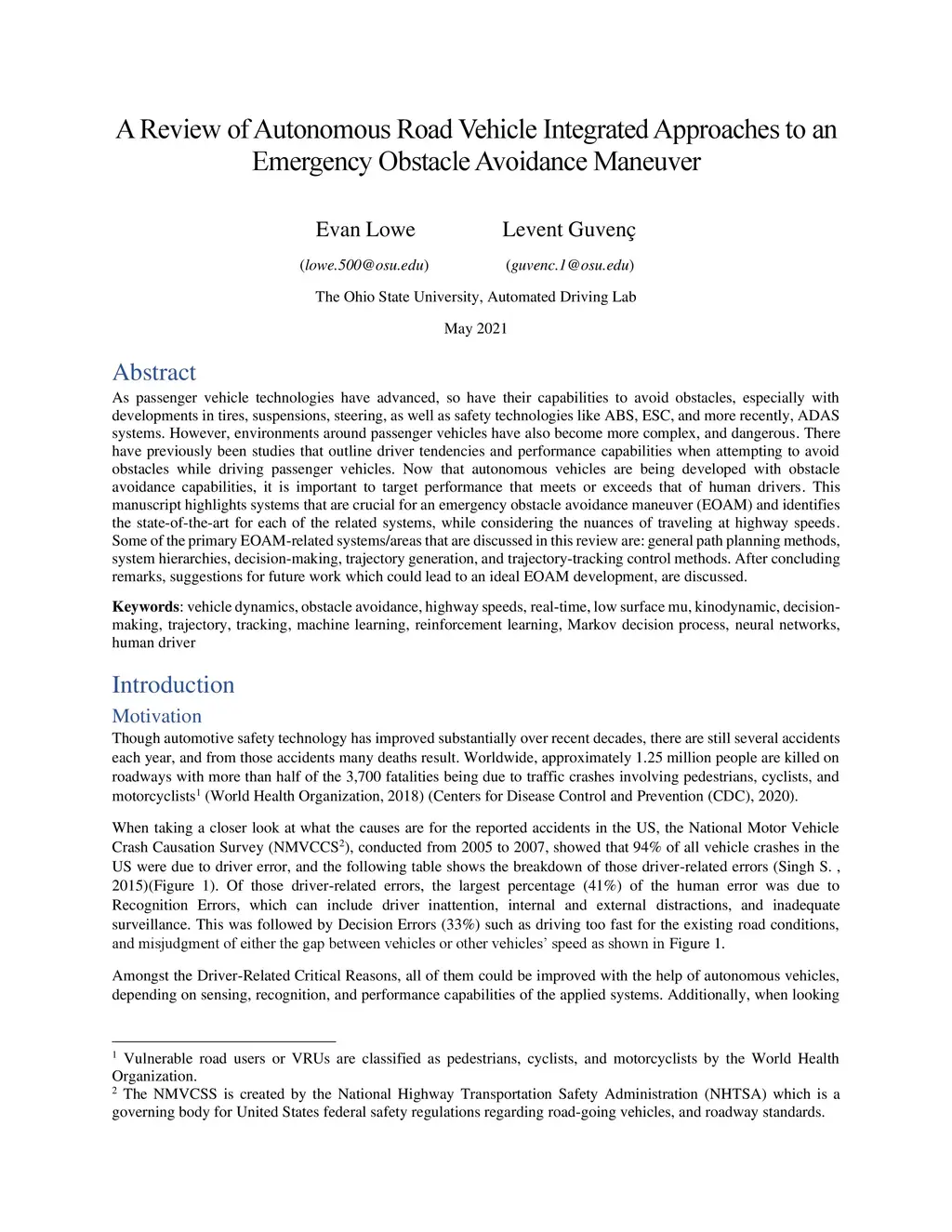 Emergency Obstacle Avoidance Maneuver