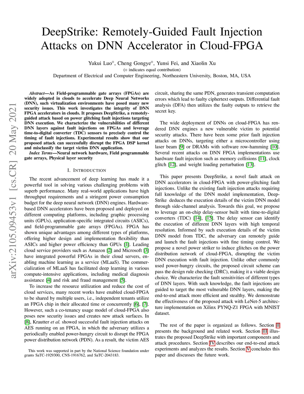 As Field-programmable gate arrays (FPGAs) are widely adopted in clouds to accelerate Deep Neural Networks (DNN), such virtualization environments have posed many new security issues. This work investigates the integrity of DNN FPGA accelerators in clouds. It proposes DeepStrike, a remotely-guided attack based on power glitching fault injections targeting DNN execution. We characterize the vulnerabilities of different DNN layers against fault injections on FPGAs and leverage time-to-digital converter (TDC) sensors to precisely control the timing of fault injections. Experimental results show that our proposed attack can successfully disrupt the FPGA DSP kernel and misclassify the target victim DNN application.