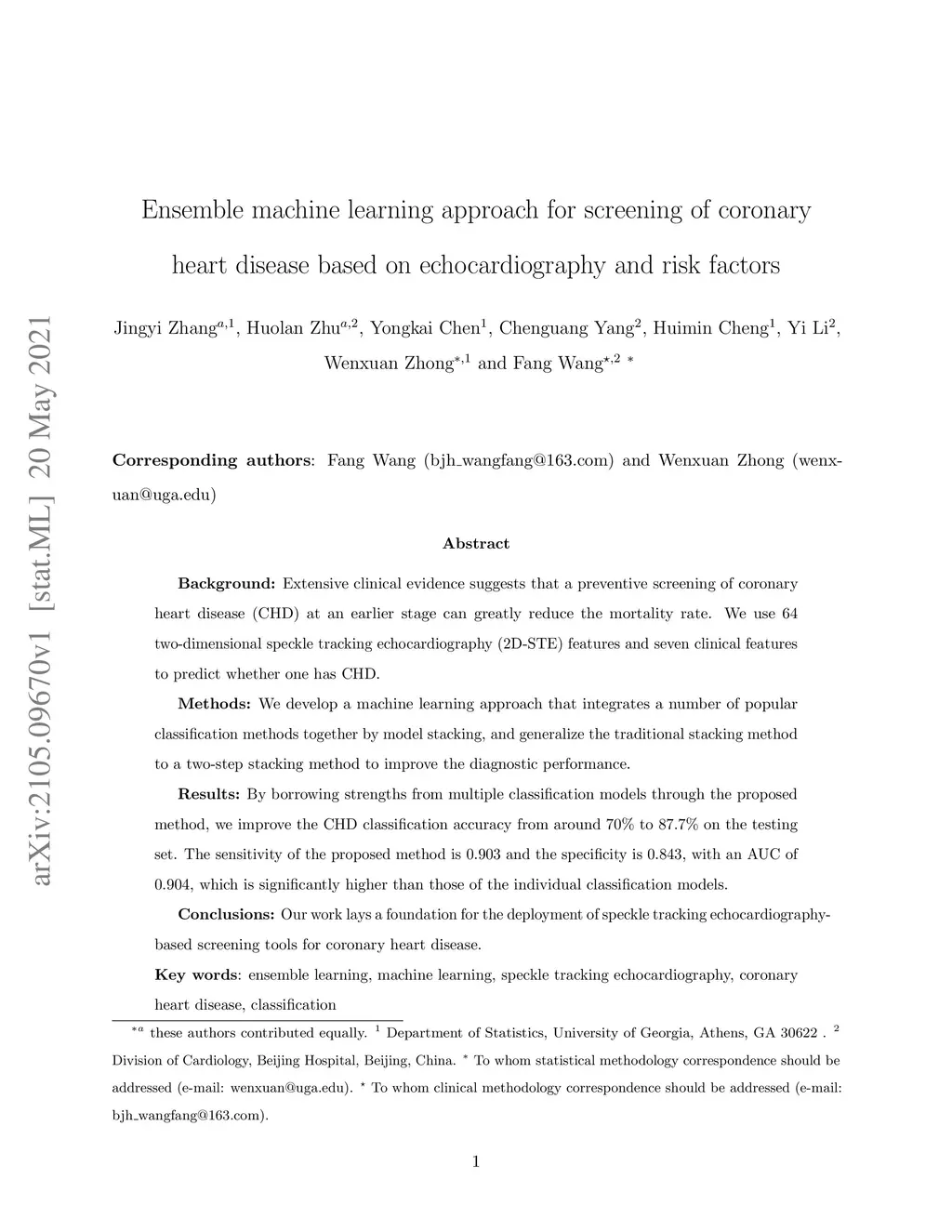 Background: Extensive clinical evidence suggests that a preventive screening of coronary heart disease (CHD) at an earlier stage can greatly reduce the mortality rate. We use 64 two-dimensional speckle tracking echocardiography (2D-STE) features and seven clinical features to predict whether one has CHD. Methods: We develop a machine learning approach that integrates a number of popular classification methods together by model stacking, and generalize the traditional stacking method to a two-step stacking method to improve the diagnostic performance. Results: By borrowing strengths from multiple classification models through the proposed method, we improve the CHD classification accuracy from around 70% to 87.7% on the testing set. The sensitivity of the proposed method is 0.903 and the specificity is 0.843, with an AUC of 0.904, which is significantly higher than those of the individual classification models. Conclusions: Our work lays a foundation for the deployment of speckle tracking echocardiography-based screening tools for coronary heart disease.
