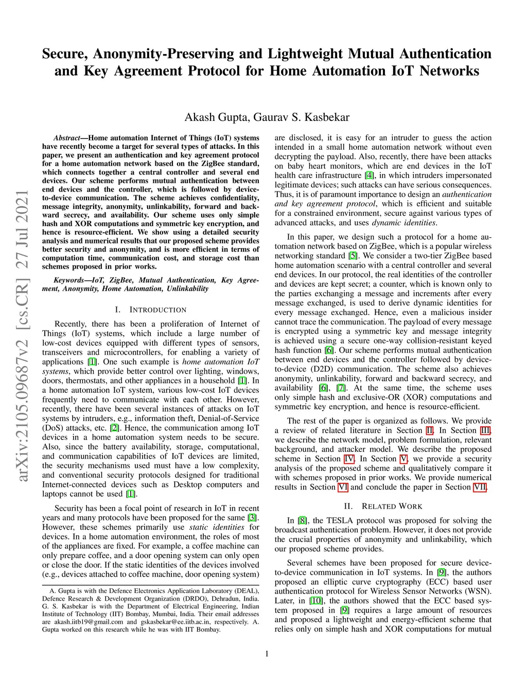 Home automation Internet of Things (IoT) systems have recently become a target for several types of attacks. In this paper, we present an authentication and key agreement protocol for a home automation network based on the ZigBee standard, which connects together a central controller and several end devices. Our scheme performs mutual authentication between end devices and the controller, which is followed by device-to-device communication. The scheme achieves confidentiality, message integrity, anonymity, unlinkability, forward and backward secrecy, and availability. Our scheme uses only simple hash and XOR computations and symmetric key encryption, and hence is resource-efficient. We show using a detailed security analysis and numerical results that our proposed scheme provides better security and anonymity, and is more efficient in terms of computation time, communication cost, and storage cost than schemes proposed in prior works.