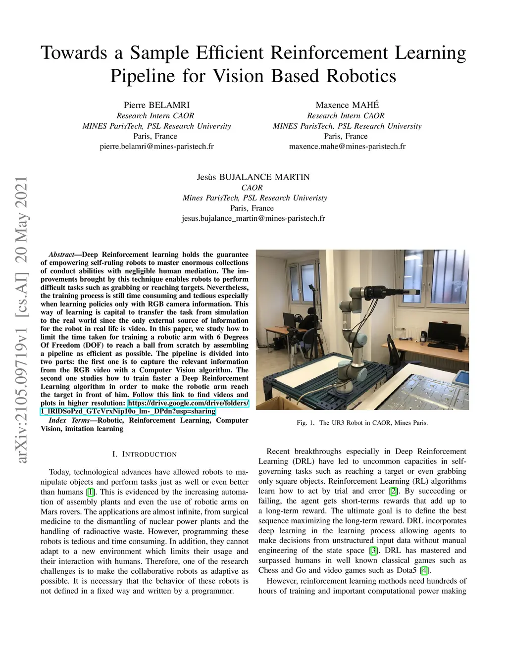 Deep Reinforcement learning holds the guarantee of empowering self-ruling robots to master enormous collections of conduct abilities with negligible human mediation. The improvements brought by this technique enables robots to perform difficult tasks such as grabbing or reaching targets. Nevertheless, the training process is still time consuming and tedious especially when learning policies only with RGB camera information. This way of learning is capital to transfer the task from simulation to the real world since the only external source of information for the robot in real life is video. In this paper, we study how to limit the time taken for training a robotic arm with 6 Degrees Of Freedom (DOF) to reach a ball from scratch by assembling a pipeline as efficient as possible. The pipeline is divided into two parts: the first one is to capture the relevant information from the RGB video with a Computer Vision algorithm. The second one studies how to train faster a Deep Reinforcement Learning algorithm in order to make the robotic arm reach the target in front of him. Follow this link to find videos and plots in higher resolution: \url{https://drive.google.com/drive/folders/1_lRlDSoPzd_GTcVrxNip10o_lm-_DPdn?usp=sharing}