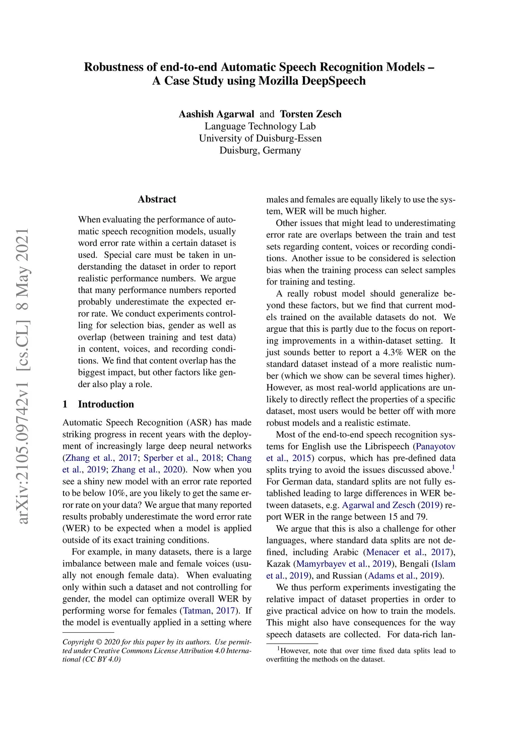 When evaluating the performance of automatic speech recognition models, usually word error rate within a certain dataset is used. Special care must be taken in understanding the dataset in order to report realistic performance numbers. We argue that many performance numbers reported probably underestimate the expected error rate. We conduct experiments controlling for selection bias, gender as well as overlap (between training and test data) in content, voices, and recording conditions. We find that content overlap has the biggest impact, but other factors like gender also play a role.