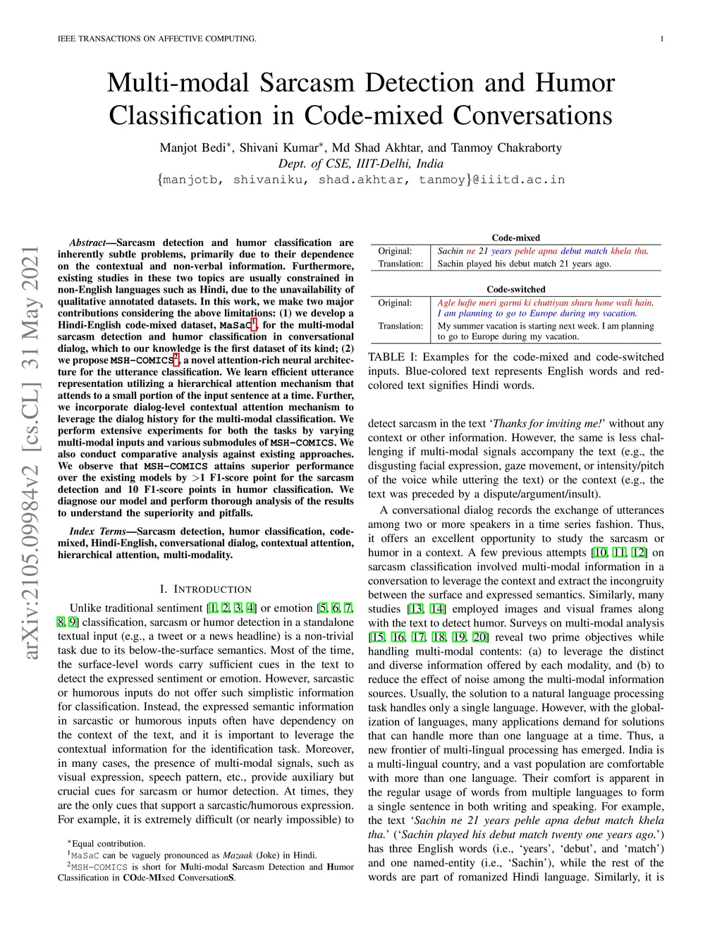 Multi-modal Sarcasm Detection and Humor Classification in Code-mixed
