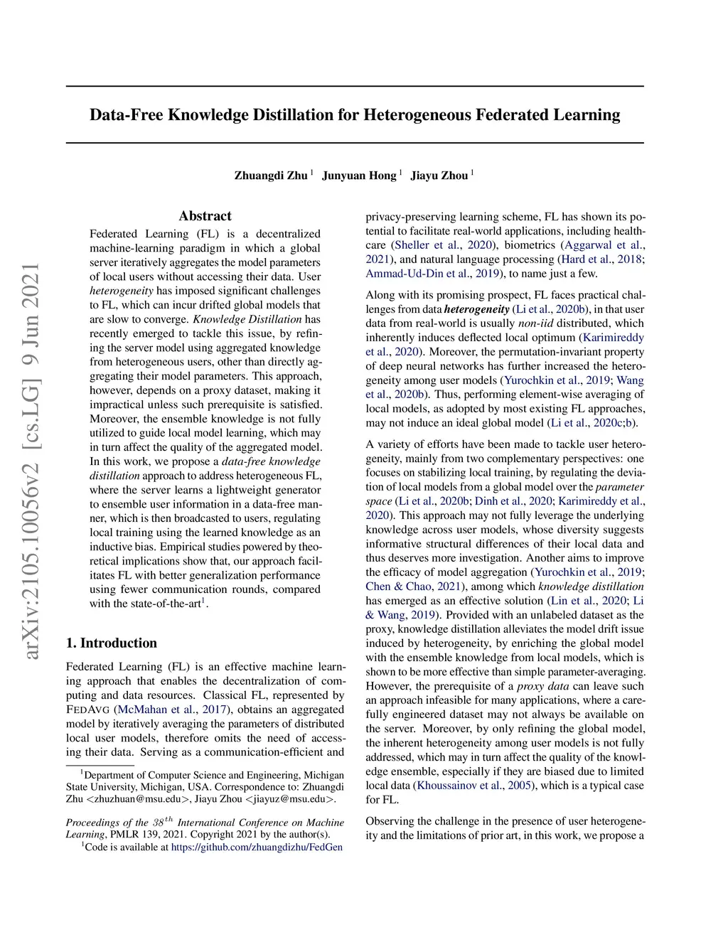 Federated Learning (FL) is a decentralized machine-learning paradigm, in which a global server iteratively averages the model parameters of local users without accessing their data. User heterogeneity has imposed significant challenges to FL, which can incur drifted global models that are slow to converge. Knowledge Distillation has recently emerged to tackle this issue, by refining the server model using aggregated knowledge from heterogeneous users, other than directly averaging their model parameters. This approach, however, depends on a proxy dataset, making it impractical unless such a prerequisite is satisfied. Moreover, the ensemble knowledge is not fully utilized to guide local model learning, which may in turn affect the quality of the aggregated model. Inspired by the prior art, we propose a data-free knowledge distillation} approach to address heterogeneous FL, where the server learns a lightweight generator to ensemble user information in a data-free manner, which is then broadcasted to users, regulating local training using the learned knowledge as an inductive bias. Empirical studies powered by theoretical implications show that, our approach facilitates FL with better generalization performance using fewer communication rounds, compared with the state-of-the-art.