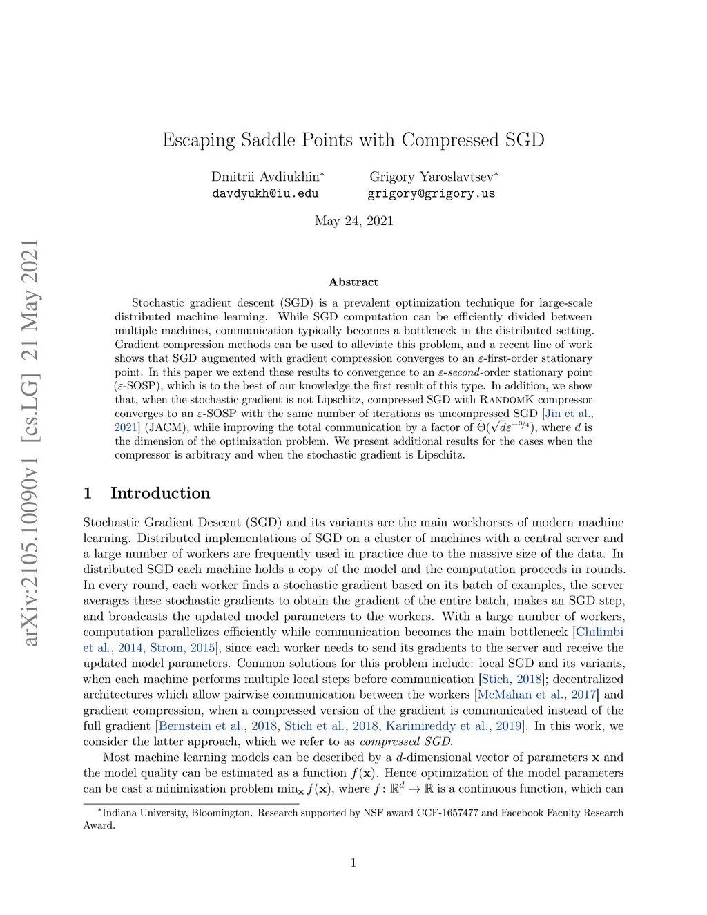 Stochastic gradient descent (SGD) is a prevalent optimization technique for large-scale distributed machine learning. While SGD computation can be efficiently divided between multiple machines, communication typically becomes a bottleneck in the distributed setting. Gradient compression methods can be used to alleviate this problem, and a recent line of work shows that SGD augmented with gradient compression converges to an -first-order stationary point. In this paper we extend these results to convergence to an -second-order stationary point (-SOSP), which is to the best of our knowledge the first result of this type. In addition, we show that, when the stochastic gradient is not Lipschitz, compressed SGD with RandomK compressor converges to an -SOSP with the same number of iterations as uncompressed SGD [Jin et al.,2021] (JACM), while improving the total communication by a factor of , where is the dimension of the optimization problem. We present additional results for the cases when the compressor is arbitrary and when the stochastic gradient is Lipschitz.