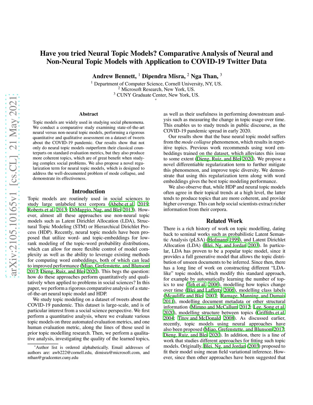 Topic models are widely used in studying social phenomena. We conduct a comparative study examining state-of-the-art neural versus non-neural topic models, performing a rigorous quantitative and qualitative assessment on a dataset of tweets about the COVID-19 pandemic. Our results show that not only do neural topic models outperform their classical counterparts on standard evaluation metrics, but they also produce more coherent topics, which are of great benefit when studying complex social problems. We also propose a novel regularization term for neural topic models, which is designed to address the well-documented problem of mode collapse, and demonstrate its effectiveness.
