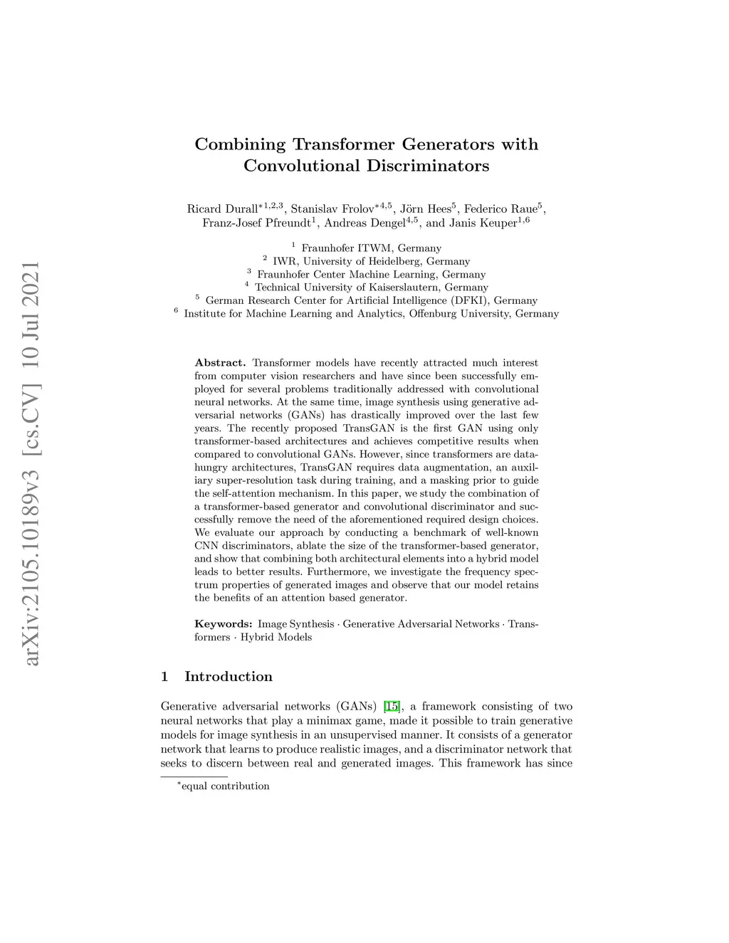 Transformer models have recently attracted much interest from computer vision researchers and have since been successfully employed for several problems traditionally addressed with convolutional neural networks. At the same time, image synthesis using generative adversarial networks (GANs) has drastically improved over the last few years. The recently proposed TransGAN is the first GAN using only transformer-based architectures and achieves competitive results when compared to convolutional GANs. However, since transformers are data-hungry architectures, TransGAN requires data augmentation, an auxiliary super-resolution task during training, and a masking prior to guide the self-attention mechanism. In this paper, we study the combination of a transformer-based generator and convolutional discriminator and successfully remove the need of the aforementioned required design choices. We evaluate our approach by conducting a benchmark of well-known CNN discriminators, ablate the size of the transformer-based generator, and show that combining both architectural elements into a hybrid model leads to better results. Furthermore, we investigate the frequency spectrum properties of generated images and observe that our model retains the benefits of an attention based generator.