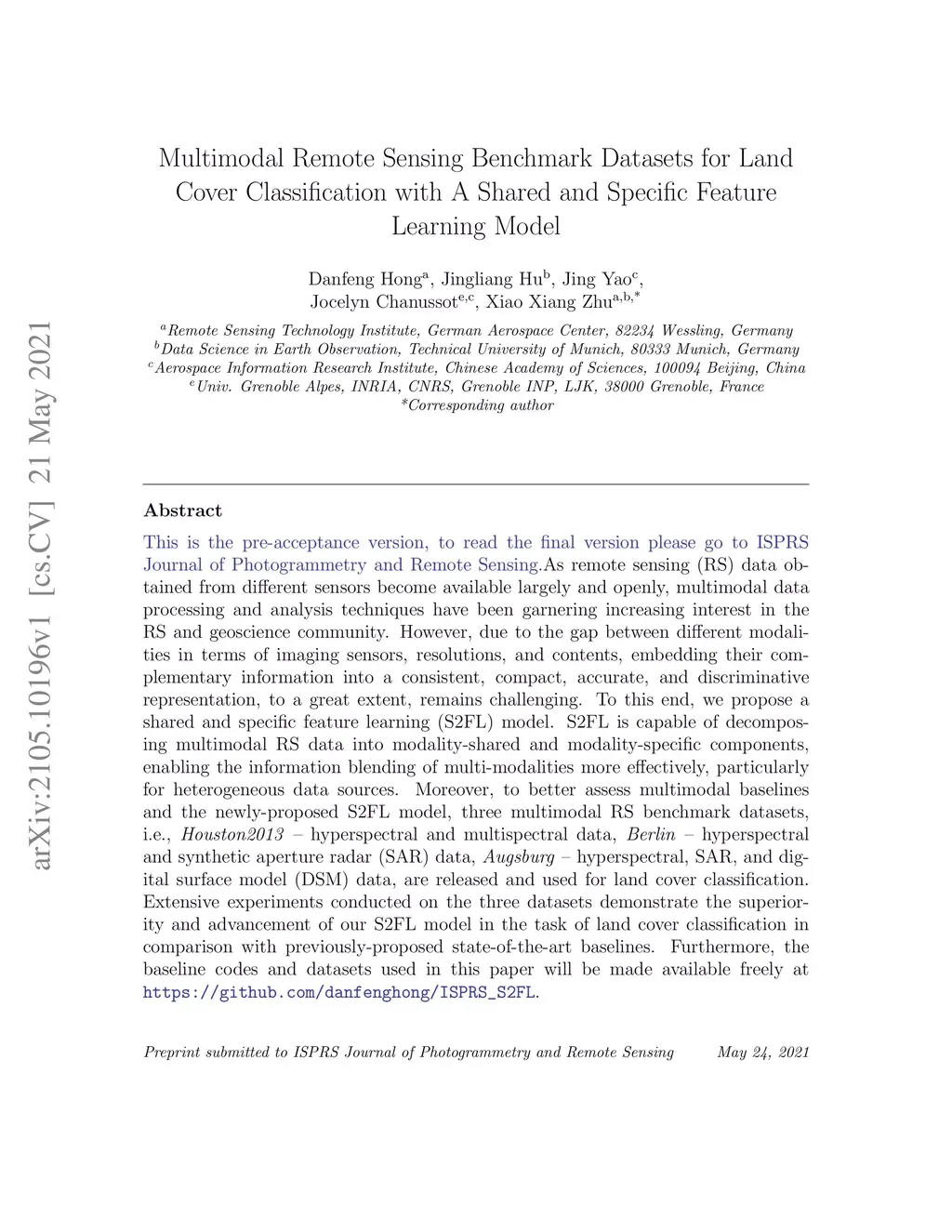 As remote sensing (RS) data obtained from different sensors become available largely and openly, multimodal data processing and analysis techniques have been garnering increasing interest in the RS and geoscience community. However, due to the gap between different modalities in terms of imaging sensors, resolutions, and contents, embedding their complementary information into a consistent, compact, accurate, and discriminative representation, to a great extent, remains challenging. To this end, we propose a shared and specific feature learning (S2FL) model. S2FL is capable of decomposing multimodal RS data into modality-shared and modality-specific components, enabling the information blending of multi-modalities more effectively, particularly for heterogeneous data sources. Moreover, to better assess multimodal baselines and the newly-proposed S2FL model, three multimodal RS benchmark datasets, i.e., Houston2013 -- hyperspectral and multispectral data, Berlin -- hyperspectral and synthetic aperture radar (SAR) data, Augsburg -- hyperspectral, SAR, and digital surface model (DSM) data, are released and used for land cover classification. Extensive experiments conducted on the three datasets demonstrate the superiority and advancement of our S2FL model in the task of land cover classification in comparison with previously-proposed state-of-the-art baselines. Furthermore, the baseline codes and datasets used in this paper will be made available freely at https://github.com/danfenghong/ISPRS_S2FL.