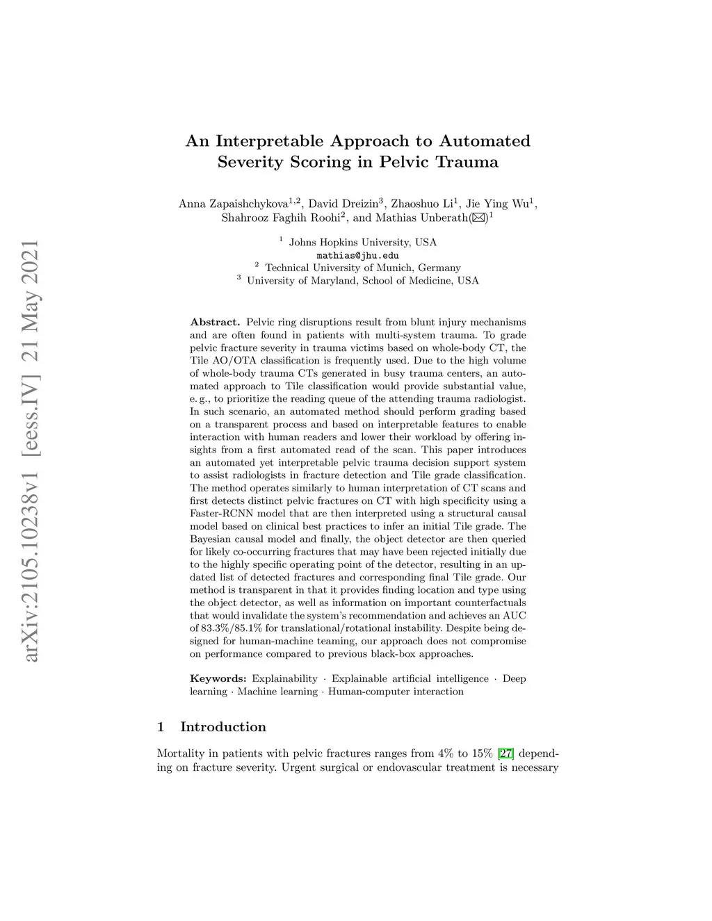 Pelvic ring disruptions result from blunt injury mechanisms and are often found in patients with multi-system trauma. To grade pelvic fracture severity in trauma victims based on whole-body CT, the Tile AO/OTA classification is frequently used. Due to the high volume of whole-body trauma CTs generated in busy trauma centers, an automated approach to Tile classification would provide substantial value, e.,g., to prioritize the reading queue of the attending trauma radiologist. In such scenario, an automated method should perform grading based on a transparent process and based on interpretable features to enable interaction with human readers and lower their workload by offering insights from a first automated read of the scan. This paper introduces an automated yet interpretable pelvic trauma decision support system to assist radiologists in fracture detection and Tile grade classification. The method operates similarly to human interpretation of CT scans and first detects distinct pelvic fractures on CT with high specificity using a Faster-RCNN model that are then interpreted using a structural causal model based on clinical best practices to infer an initial Tile grade. The Bayesian causal model and finally, the object detector are then queried for likely co-occurring fractures that may have been rejected initially due to the highly specific operating point of the detector, resulting in an updated list of detected fractures and corresponding final Tile grade. Our method is transparent in that it provides finding location and type using the object detector, as well as information on important counterfactuals that would invalidate the system's recommendation and achieves an AUC of 83.3%/85.1% for translational/rotational instability. Despite being designed for human-machine teaming, our approach does not compromise on performance compared to previous black-box approaches.