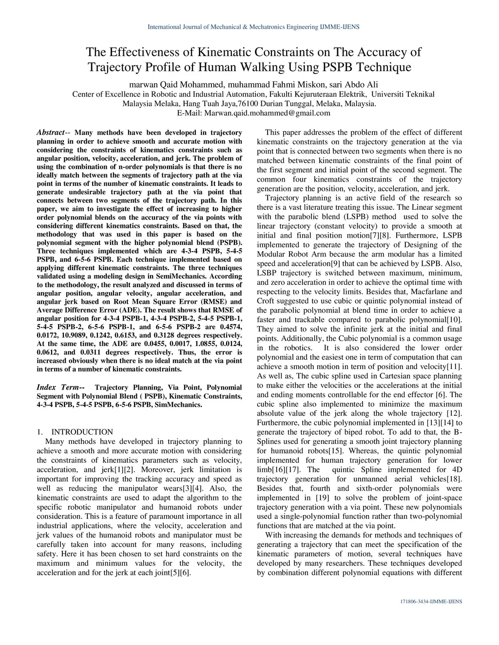 Many methods have been developed in trajectory planning in order to achieve smooth and accurate motion with considering the constraints of kinematics constraints such as angular position, velocity, acceleration, and jerk. The problem of using the combination of n-order polynomials is that there is no ideally match between the segments of trajectory path at the via point in terms of the number of kinematic constraints. It leads to generate undesirable trajectory path at the via point that connects between two segments of the trajectory path. In this paper, we aim to investigate the effect of increasing to higher order polynomial blends on the accuracy of the via points with considering different kinematics constraints. Based on that, the methodology that was used in this paper is based on the polynomial segment with the higher polynomial blend (PSPB). Three techniques implemented which are 4-3-4 PSPB, 5-4-5 PSPB, and 6-5-6 PSPB. Each technique implemented based on applying different kinematic constraints. The three techniques validated using a modeling design in SemiMechanics. According to the methodology, the result analyzed and discussed in terms of angular position, angular velocity, angular acceleration, and angular jerk based on Root Mean Square Error (RMSE) and Average Difference Error (ADE). The result shows that RMSE of angular position for 4-3-4 PSPB-1, 4-3-4 PSPB-2, 5-4-5 PSPB-1, 5-4-5 PSPB-2, 6-5-6 PSPB-1, and 6-5-6 PSPB-2 are 0.4574, 0.0172, 10.9089, 0.1242, 0.6153, and 0.3128 degrees respectively. At the same time, the ADE are 0.0455, 0.0017, 1.0855, 0.0124, 0.0612, and 0.0311 degrees respectively. Thus, the error is increased obviously when there is no ideal match at the via point in terms of a number of kinematic constraints.