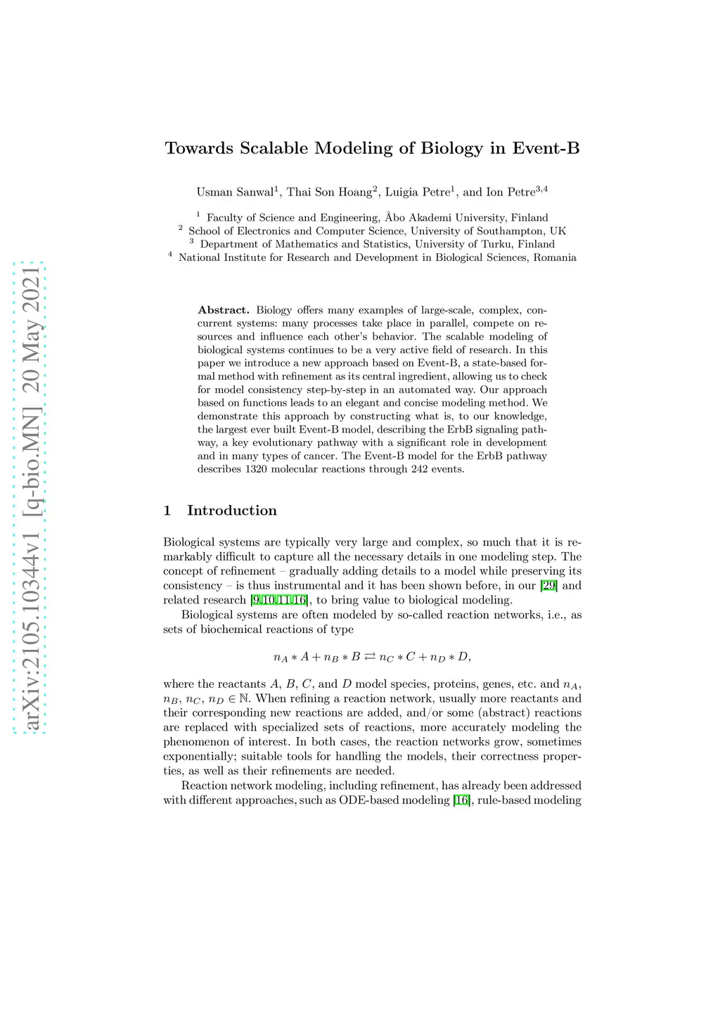 Biology offers many examples of large-scale, complex, concurrent systems: many processes take place in parallel, compete on resources and influence each other's behavior. The scalable modeling of biological systems continues to be a very active field of research. In this paper we introduce a new approach based on Event-B, a state-based formal method with refinement as its central ingredient, allowing us to check for model consistency step-by-step in an automated way. Our approach based on functions leads to an elegant and concise modeling method. We demonstrate this approach by constructing what is, to our knowledge, the largest ever built Event-B model, describing the ErbB signaling pathway, a key evolutionary pathway with a significant role in development and in many types of cancer. The Event-B model for the ErbB pathway describes 1320 molecular reactions through 242 events.