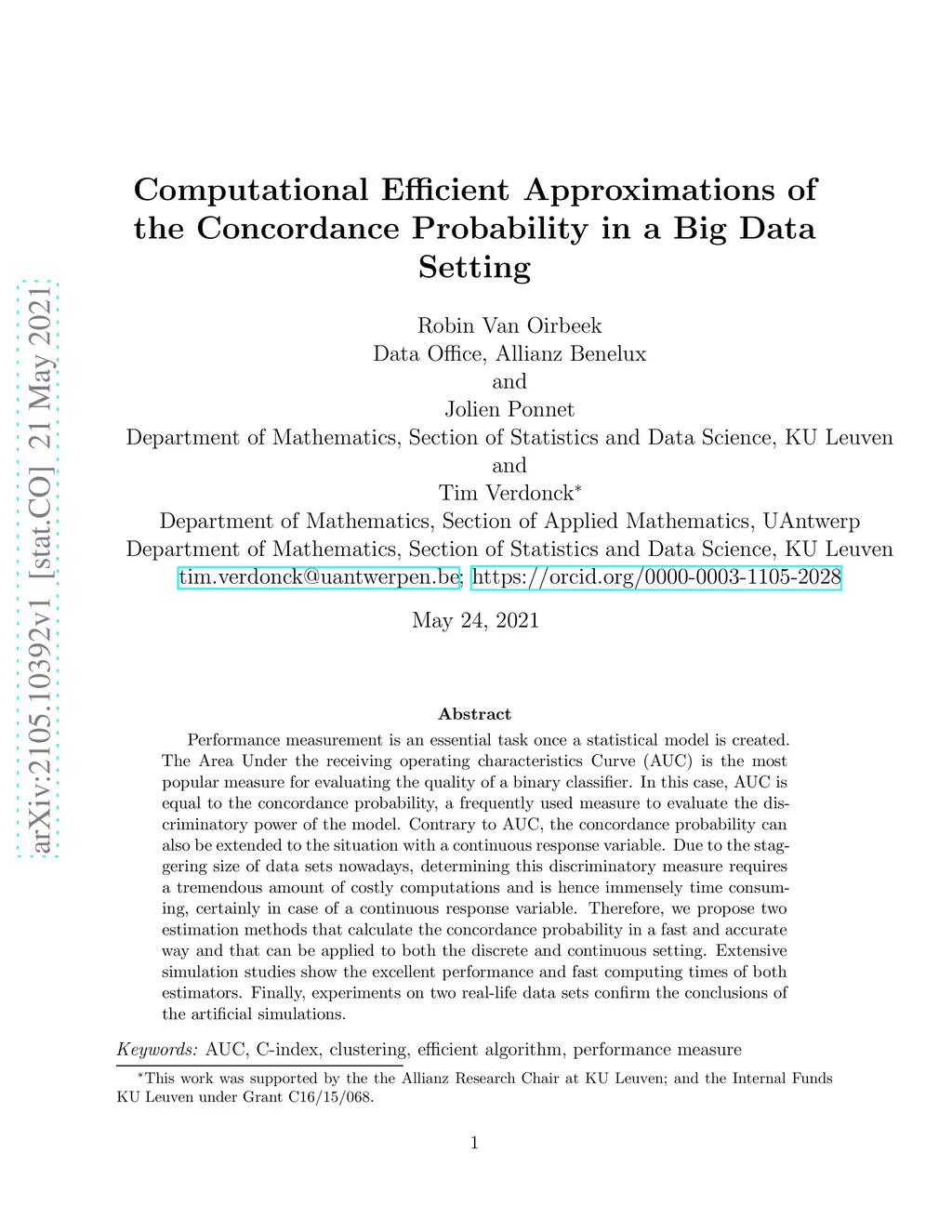 Performance measurement is an essential task once a statistical model is created. The Area Under the receiving operating characteristics Curve (AUC) is the most popular measure for evaluating the quality of a binary classifier. In this case, AUC is equal to the concordance probability, a frequently used measure to evaluate the discriminatory power of the model. Contrary to AUC, the concordance probability can also be extended to the situation with a continuous response variable. Due to the staggering size of data sets nowadays, determining this discriminatory measure requires a tremendous amount of costly computations and is hence immensely time consuming, certainly in case of a continuous response variable. Therefore, we propose two estimation methods that calculate the concordance probability in a fast and accurate way and that can be applied to both the discrete and continuous setting. Extensive simulation studies show the excellent performance and fast computing times of both estimators. Finally, experiments on two real-life data sets confirm the conclusions of the artificial simulations.
