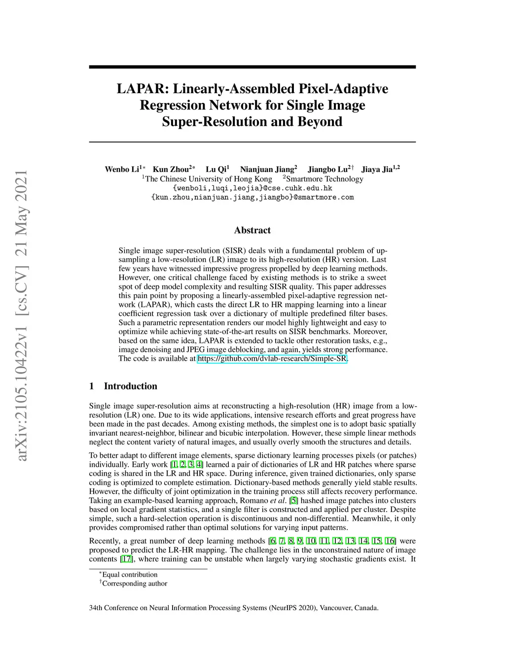 LAPAR: Linearly-Assembled Pixel-Adaptive Regression Network for Single