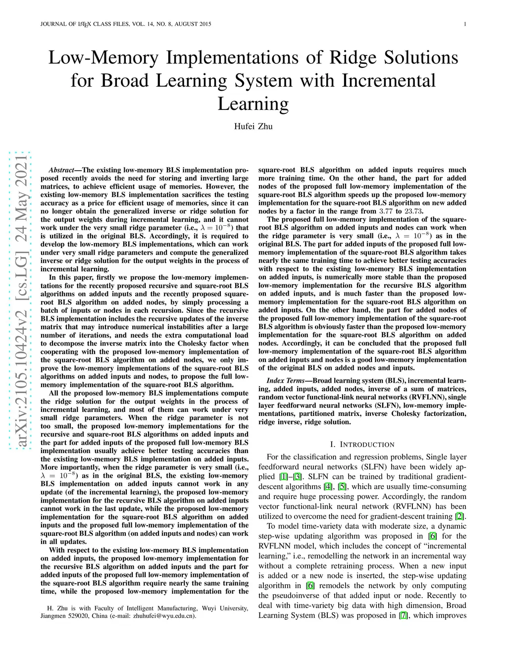 The existing low-memory BLS implementation proposed recently avoids the need for storing and inverting large matrices, to achieve efficient usage of memories. However, the existing low-memory BLS implementation sacrifices the testing accuracy as a price for efficient usage of memories, since it can no longer obtain the generalized inverse or ridge solution for the output weights during incremental learning, and it cannot work under the very small ridge parameter that is utilized in the original BLS. Accordingly, it is required to develop the low-memory BLS implementations, which can work under very small ridge parameters and compute the generalized inverse or ridge solution for the output weights in the process of incremental learning. In this paper, firstly we propose the low-memory implementations for the recently proposed recursive and square-root BLS algorithms on added inputs and the recently proposed squareroot BLS algorithm on added nodes, by simply processing a batch of inputs or nodes in each recursion. Since the recursive BLS implementation includes the recursive updates of the inverse matrix that may introduce numerical instabilities after a large number of iterations, and needs the extra computational load to decompose the inverse matrix into the Cholesky factor when cooperating with the proposed low-memory implementation of the square-root BLS algorithm on added nodes, we only improve the low-memory implementations of the square-root BLS algorithms on added inputs and nodes, to propose the full lowmemory implementation of the square-root BLS algorithm. All the proposed low-memory BLS implementations compute the ridge solution for the output weights in the process of incremental learning, and most of them can work under very small ridge parameters.