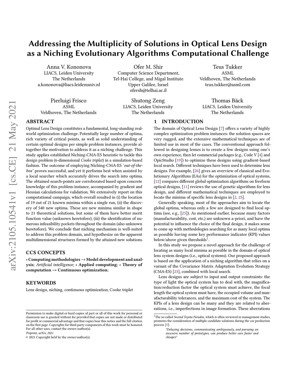 Optimal Lens Design constitutes a fundamental, long-standing real-world optimization challenge. Potentially large number of optima, rich variety of critical points, as well as solid understanding of certain optimal designs per simple problem instances, provide altogether the motivation to address it as a niching challenge. This study applies established Niching-CMA-ES heuristic to tackle this design problem (6-dimensional Cooke triplet) in a simulation-based fashion. The outcome of employing Niching-CMA-ES `out-of-the-box' proves successful, and yet it performs best when assisted by a local searcher which accurately drives the search into optima. The obtained search-points are corroborated based upon concrete knowledge of this problem-instance, accompanied by gradient and Hessian calculations for validation. We extensively report on this computational campaign, which overall resulted in (i) the location of 19 out of 21 known minima within a single run, (ii) the discovery of 540 new optima. These are new minima similar in shape to 21 theoretical solutions, but some of them have better merit function value (unknown heretofore), (iii) the identification of numerous infeasibility pockets throughout the domain (also unknown heretofore). We conclude that niching mechanism is well-suited to address this problem domain, and hypothesize on the apparent multidimensional structures formed by the attained new solutions.