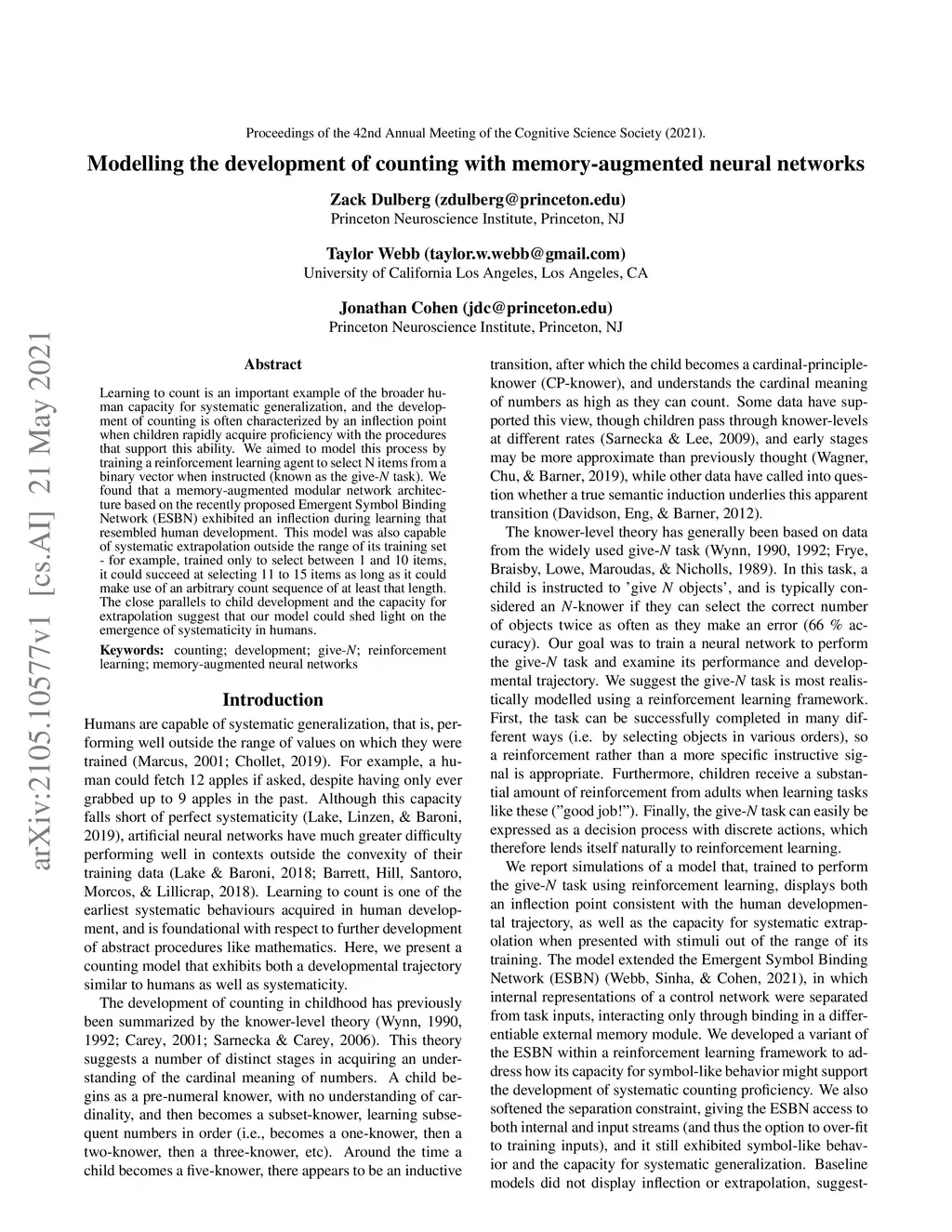 Learning to count is an important example of the broader human capacity for systematic generalization, and the development of counting is often characterized by an inflection point when children rapidly acquire proficiency with the procedures that support this ability. We aimed to model this process by training a reinforcement learning agent to select N items from a binary vector when instructed (known as the give- task). We found that a memory-augmented modular network architecture based on the recently proposed Emergent Symbol Binding Network (ESBN) exhibited an inflection during learning that resembled human development. This model was also capable of systematic extrapolation outside the range of its training set - for example, trained only to select between 1 and 10 items, it could succeed at selecting 11 to 15 items as long as it could make use of an arbitrary count sequence of at least that length. The close parallels to child development and the capacity for extrapolation suggest that our model could shed light on the emergence of systematicity in humans.