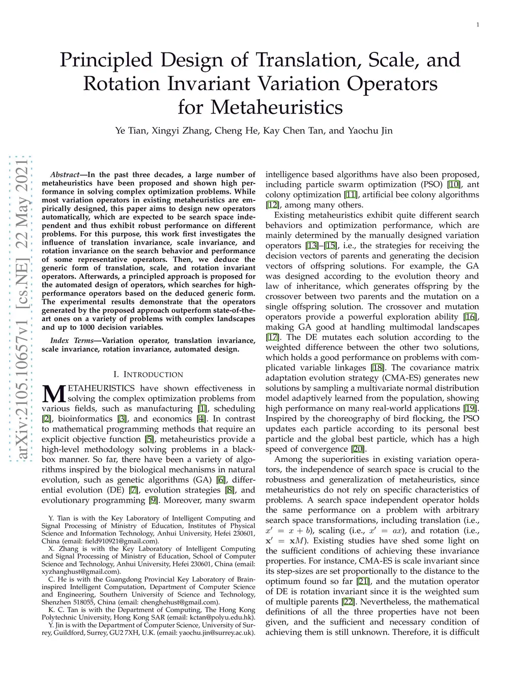In the past three decades, a large number of metaheuristics have been proposed and shown high performance in solving complex optimization problems. While most variation operators in existing metaheuristics are empirically designed, this paper aims to design new operators automatically, which are expected to be search space independent and thus exhibit robust performance on different problems. For this purpose, this work first investigates the influence of translation invariance, scale invariance, and rotation invariance on the search behavior and performance of some representative operators. Then, we deduce the generic form of translation, scale, and rotation invariant operators. Afterwards, a principled approach is proposed for the automated design of operators, which searches for high-performance operators based on the deduced generic form. The experimental results demonstrate that the operators generated by the proposed approach outperform state-of-the-art ones on a variety of problems with complex landscapes and up to 1000 decision variables.