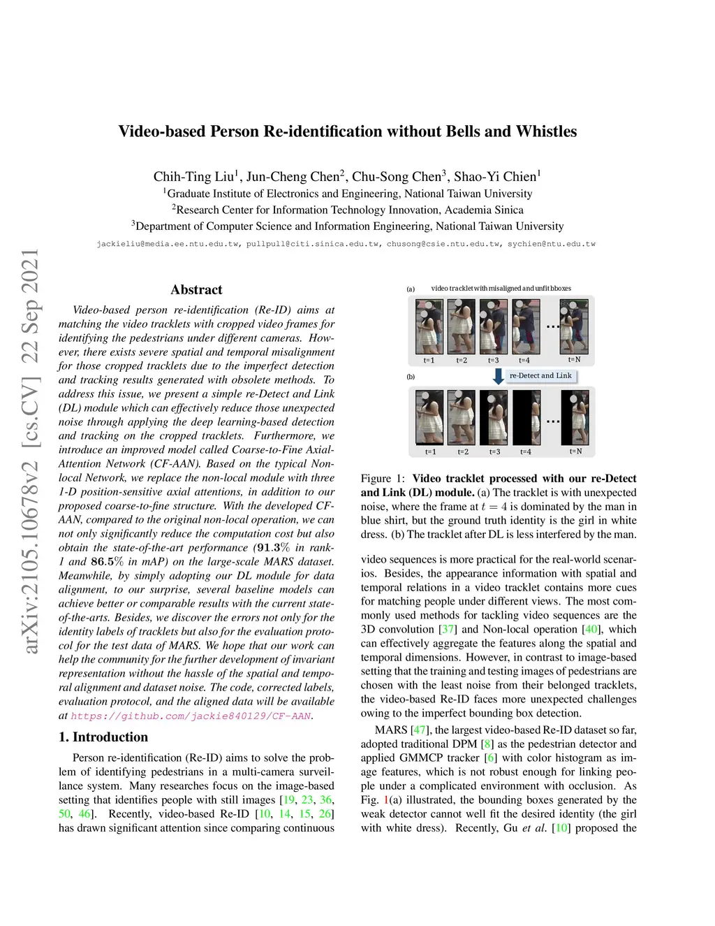 Video-based person re-identification (Re-ID) aims at matching the video tracklets with cropped video frames for identifying the pedestrians under different cameras. However, there exists severe spatial and temporal misalignment for those cropped tracklets due to the imperfect detection and tracking results generated with obsolete methods. To address this issue, we present a simple re-Detect and Link (DL) module which can effectively reduce those unexpected noise through applying the deep learning-based detection and tracking on the cropped tracklets. Furthermore, we introduce an improved model called Coarse-to-Fine Axial-Attention Network (CF-AAN). Based on the typical Non-local Network, we replace the non-local module with three 1-D position-sensitive axial attentions, in addition to our proposed coarse-to-fine structure. With the developed CF-AAN, compared to the original non-local operation, we can not only significantly reduce the computation cost but also obtain the state-of-the-art performance (91.3% in rank-1 and 86.5% in mAP) on the large-scale MARS dataset. Meanwhile, by simply adopting our DL module for data alignment, to our surprise, several baseline models can achieve better or comparable results with the current state-of-the-arts. Besides, we discover the errors not only for the identity labels of tracklets but also for the evaluation protocol for the test data of MARS. We hope that our work can help the community for the further development of invariant representation without the hassle of the spatial and temporal alignment and dataset noise. The code, corrected labels, evaluation protocol, and the aligned data will be available at https://github.com/jackie840129/CF-AAN.