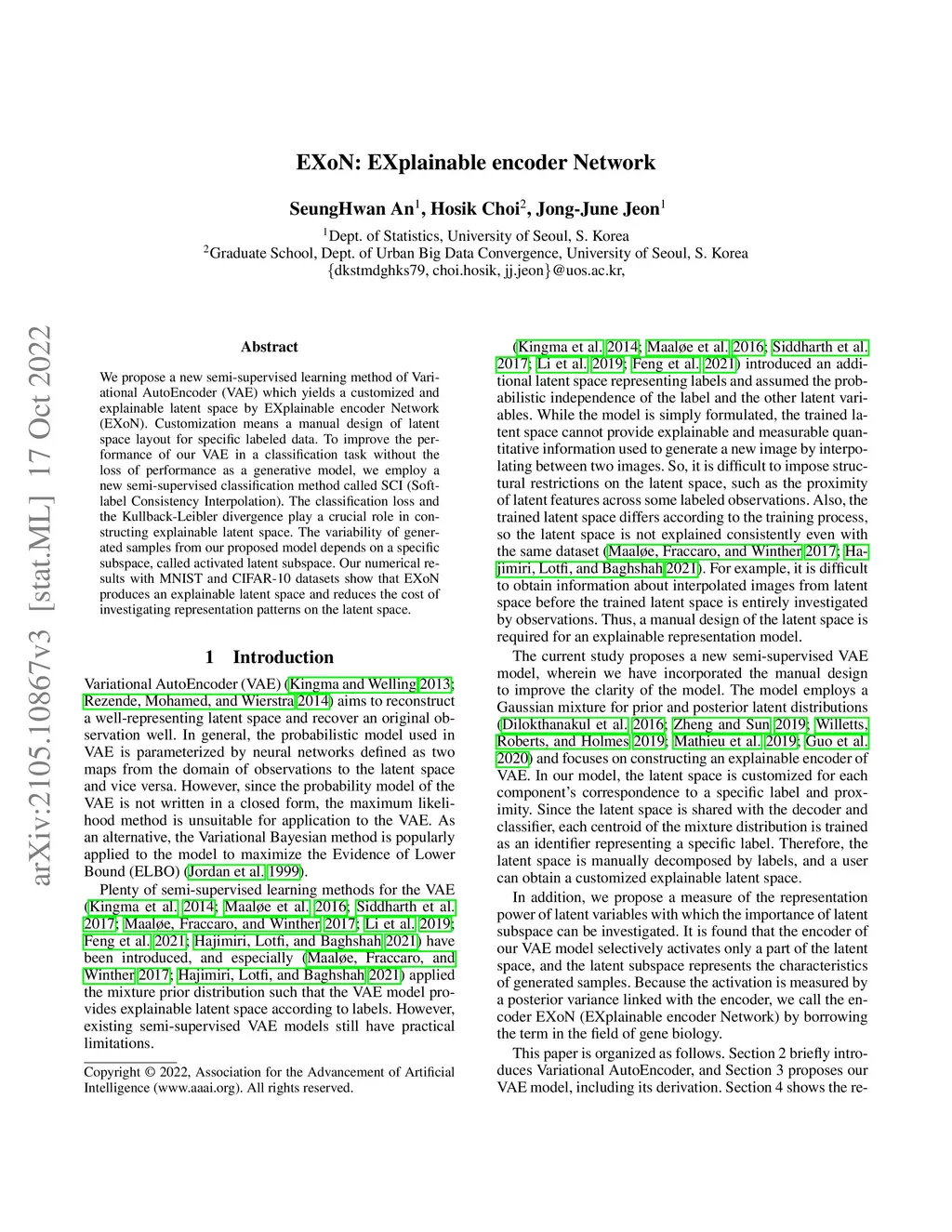 We propose a new semi-supervised learning method of Variational AutoEncoder (VAE) which yields a customized and explainable latent space by EXplainable encoder Network (EXoN). Customization means a manual design of latent space layout for specific labeled data. To improve the performance of our VAE in a classification task without the loss of performance as a generative model, we employ a new semi-supervised classification method called SCI (Soft-label Consistency Interpolation). The classification loss and the Kullback-Leibler divergence play a crucial role in constructing explainable latent space. The variability of generated samples from our proposed model depends on a specific subspace, called activated latent subspace. Our numerical results with MNIST and CIFAR-10 datasets show that EXoN produces an explainable latent space and reduces the cost of investigating representation patterns on the latent space.