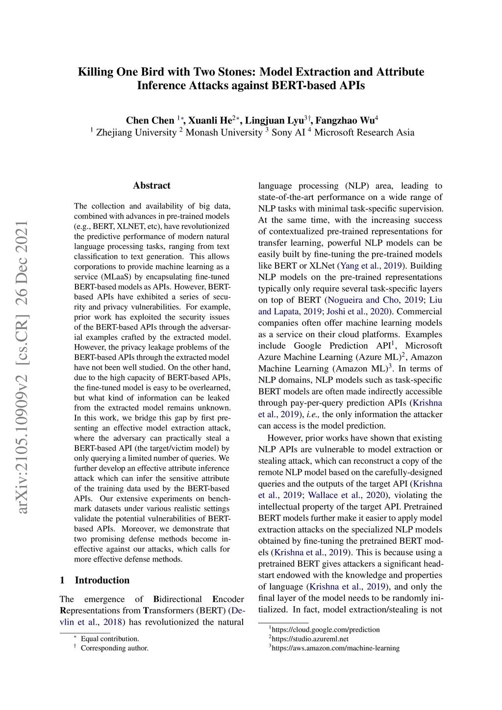 The collection and availability of big data, combined with advances in pre-trained models (e.g., BERT, XLNET, etc), have revolutionized the predictive performance of modern natural language processing tasks, ranging from text classification to text generation. This allows corporations to provide machine learning as a service (MLaaS) by encapsulating fine-tuned BERT-based models as APIs. However, BERT-based APIs have exhibited a series of security and privacy vulnerabilities. For example, prior work has exploited the security issues of the BERT-based APIs through the adversarial examples crafted by the extracted model. However, the privacy leakage problems of the BERT-based APIs through the extracted model have not been well studied. On the other hand, due to the high capacity of BERT-based APIs, the fine-tuned model is easy to be overlearned, but what kind of information can be leaked from the extracted model remains unknown. In this work, we bridge this gap by first presenting an effective model extraction attack, where the adversary can practically steal a BERT-based API (the target/victim model) by only querying a limited number of queries. We further develop an effective attribute inference attack which can infer the sensitive attribute of the training data used by the BERT-based APIs. Our extensive experiments on benchmark datasets under various realistic settings validate the potential vulnerabilities of BERT-based APIs. Moreover, we demonstrate that two promising defense methods become ineffective against our attacks, which calls for more effective defense methods.