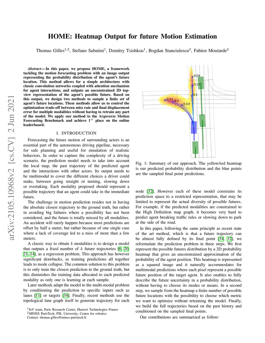 In this paper, we propose HOME, a framework tackling the motion forecasting problem with an image output representing the probability distribution of the agent's future location. This method allows for a simple architecture with classic convolution networks coupled with attention mechanism for agent interactions, and outputs an unconstrained 2D top-view representation of the agent's possible future. Based on this output, we design two methods to sample a finite set of agent's future locations. These methods allow us to control the optimization trade-off between miss rate and final displacement error for multiple modalities without having to retrain any part of the model. We apply our method to the Argoverse Motion Forecasting Benchmark and achieve 1st place on the online leaderboard.