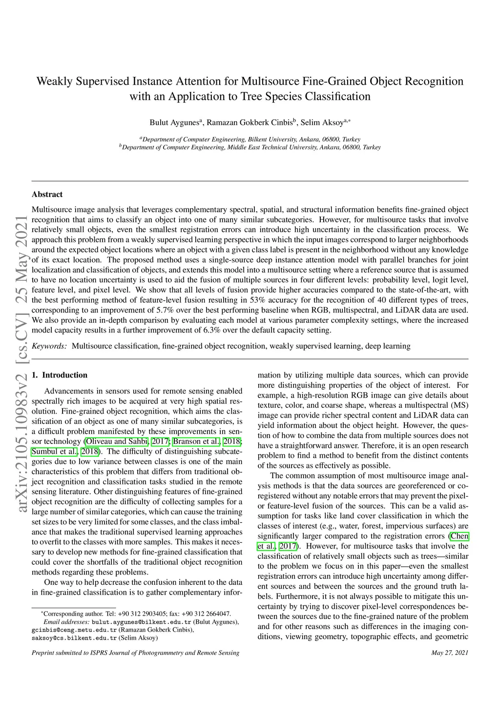 Multisource image analysis that leverages complementary spectral, spatial, and structural information benefits fine-grained object recognition that aims to classify an object into one of many similar subcategories. However, for multisource tasks that involve relatively small objects, even the smallest registration errors can introduce high uncertainty in the classification process. We approach this problem from a weakly supervised learning perspective in which the input images correspond to larger neighborhoods around the expected object locations where an object with a given class label is present in the neighborhood without any knowledge of its exact location. The proposed method uses a single-source deep instance attention model with parallel branches for joint localization and classification of objects, and extends this model into a multisource setting where a reference source that is assumed to have no location uncertainty is used to aid the fusion of multiple sources in four different levels: probability level, logit level, feature level, and pixel level. We show that all levels of fusion provide higher accuracies compared to the state-of-the-art, with the best performing method of feature-level fusion resulting in 53% accuracy for the recognition of 40 different types of trees, corresponding to an improvement of 5.7% over the best performing baseline when RGB, multispectral, and LiDAR data are used. We also provide an in-depth comparison by evaluating each model at various parameter complexity settings, where the increased model capacity results in a further improvement of 6.3% over the default capacity setting.