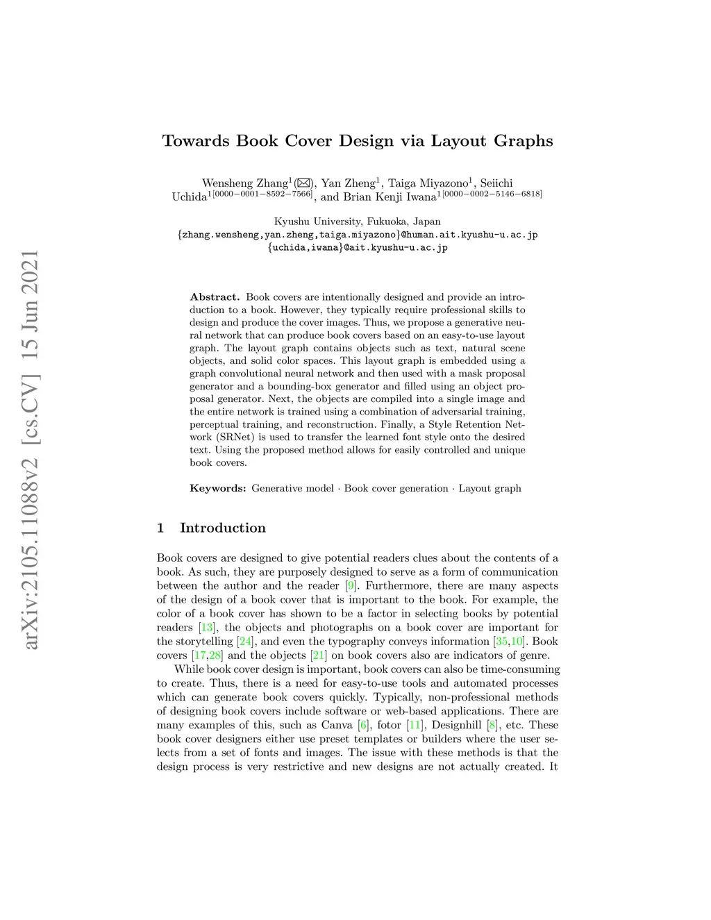 Book covers are intentionally designed and provide an introduction to a book. However, they typically require professional skills to design and produce the cover images. Thus, we propose a generative neural network that can produce book covers based on an easy-to-use layout graph. The layout graph contains objects such as text, natural scene objects, and solid color spaces. This layout graph is embedded using a graph convolutional neural network and then used with a mask proposal generator and a bounding-box generator and filled using an object proposal generator. Next, the objects are compiled into a single image and the entire network is trained using a combination of adversarial training, perceptual training, and reconstruction. Finally, a Style Retention Network (SRNet) is used to transfer the learned font style onto the desired text. Using the proposed method allows for easily controlled and unique book covers.
