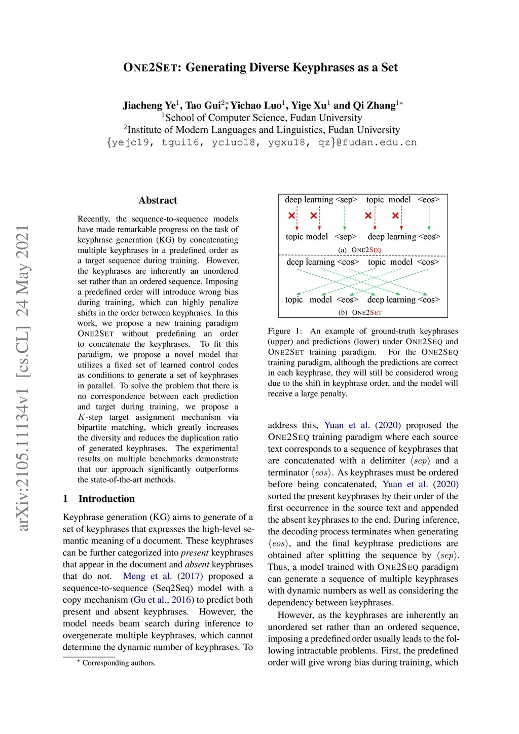 Recently, the sequence-to-sequence models have made remarkable progress on the task of keyphrase generation (KG) by concatenating multiple keyphrases in a predefined order as a target sequence during training. However, the keyphrases are inherently an unordered set rather than an ordered sequence. Imposing a predefined order will introduce wrong bias during training, which can highly penalize shifts in the order between keyphrases. In this work, we propose a new training paradigm One2Set without predefining an order to concatenate the keyphrases. To fit this paradigm, we propose a novel model that utilizes a fixed set of learned control codes as conditions to generate a set of keyphrases in parallel. To solve the problem that there is no correspondence between each prediction and target during training, we propose a -step target assignment mechanism via bipartite matching, which greatly increases the diversity and reduces the duplication ratio of generated keyphrases. The experimental results on multiple benchmarks demonstrate that our approach significantly outperforms the state-of-the-art methods.