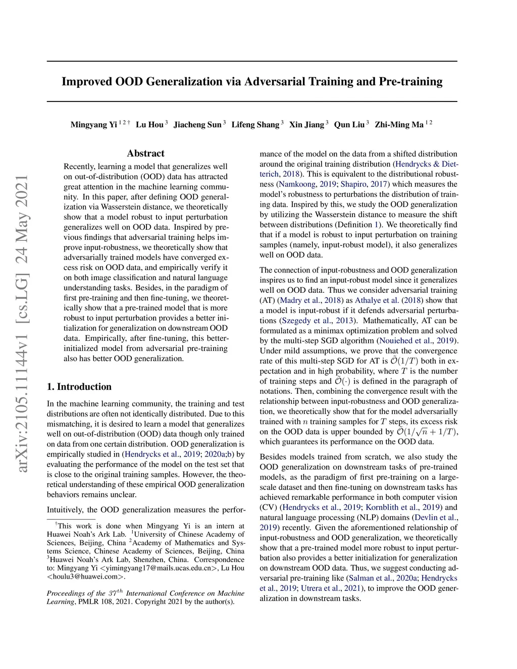 Improved OOD Generalization via Adversarial Training and Pre-training