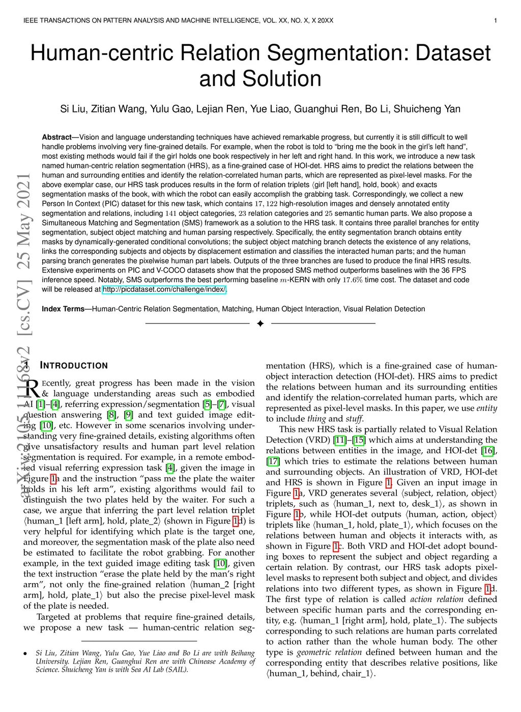 Vision and language understanding techniques have achieved remarkable progress, but currently it is still difficult to well handle problems involving very fine-grained details. For example, when the robot is told to "bring me the book in the girl's left hand", most existing methods would fail if the girl holds one book respectively in her left and right hand. In this work, we introduce a new task named human-centric relation segmentation (HRS), as a fine-grained case of HOI-det. HRS aims to predict the relations between the human and surrounding entities and identify the relation-correlated human parts, which are represented as pixel-level masks. For the above exemplar case, our HRS task produces results in the form of relation triplets <girl [left hand], hold, book> and exacts segmentation masks of the book, with which the robot can easily accomplish the grabbing task. Correspondingly, we collect a new Person In Context (PIC) dataset for this new task, which contains 17,122 high-resolution images and densely annotated entity segmentation and relations, including 141 object categories, 23 relation categories and 25 semantic human parts. We also propose a Simultaneous Matching and Segmentation (SMS) framework as a solution to the HRS task. I Outputs of the three branches are fused to produce the final HRS results. Extensive experiments on PIC and V-COCO datasets show that the proposed SMS method outperforms baselines with the 36 FPS inference speed.