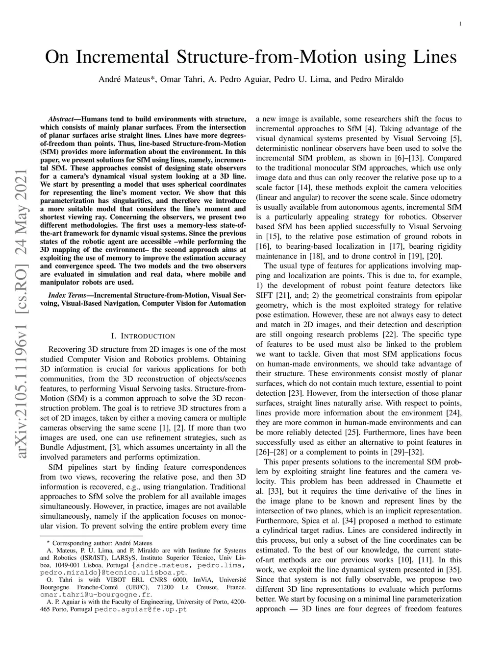 Humans tend to build environments with structure, which consists of mainly planar surfaces. From the intersection of planar surfaces arise straight lines. Lines have more degrees-of-freedom than points. Thus, line-based Structure-from-Motion (SfM) provides more information about the environment. In this paper, we present solutions for SfM using lines, namely, incremental SfM. These approaches consist of designing state observers for a camera's dynamical visual system looking at a 3D line. We start by presenting a model that uses spherical coordinates for representing the line's moment vector. We show that this parameterization has singularities, and therefore we introduce a more suitable model that considers the line's moment and shortest viewing ray. Concerning the observers, we present two different methodologies. The first uses a memory-less state-of-the-art framework for dynamic visual systems. Since the previous states of the robotic agent are accessible -- while performing the 3D mapping of the environment -- the second approach aims at exploiting the use of memory to improve the estimation accuracy and convergence speed. The two models and the two observers are evaluated in simulation and real data, where mobile and manipulator robots are used.
