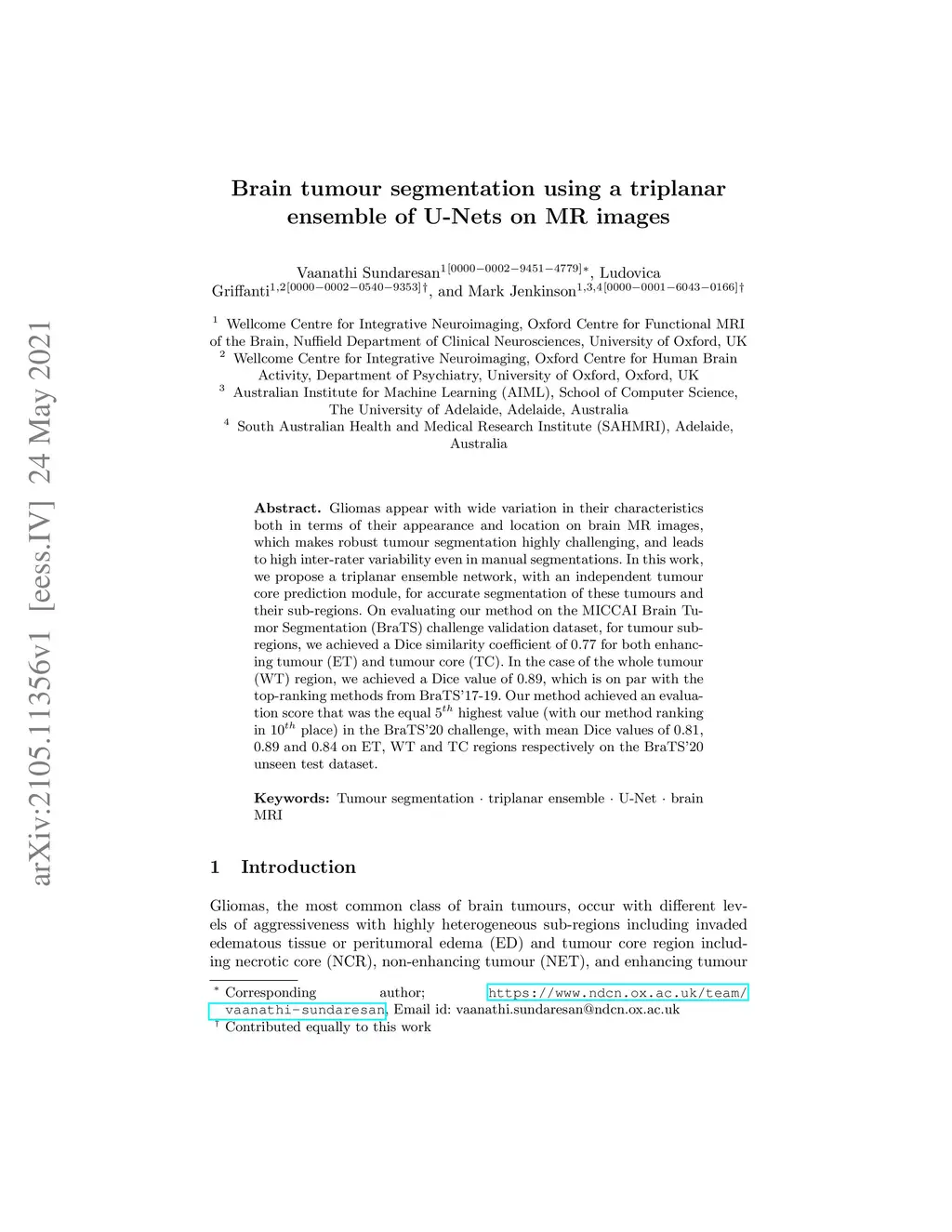 Brain tumour segmentation using a triplanar ensemble of U-Nets