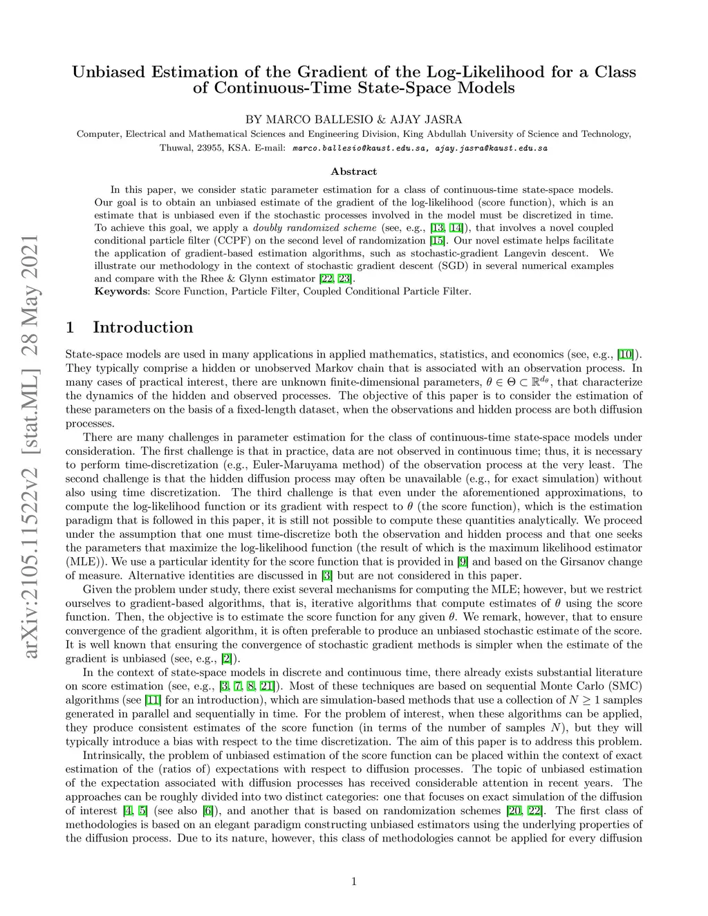 In this paper, we consider static parameter estimation for a class of continuous-time state-space models. Our goal is to obtain an unbiased estimate of the gradient of the log-likelihood (score function), which is an estimate that is unbiased even if the stochastic processes involved in the model must be discretized in time. To achieve this goal, we apply a \emph{doubly randomized scheme} (see, e.g.,~\cite{ub_mcmc, ub_grad}), that involves a novel coupled conditional particle filter (CCPF) on the second level of randomization \cite{jacob2}. Our novel estimate helps facilitate the application of gradient-based estimation algorithms, such as stochastic-gradient Langevin descent. We illustrate our methodology in the context of stochastic gradient descent (SGD) in several numerical examples and compare with the Rhee \& Glynn estimator \cite{rhee,vihola}.