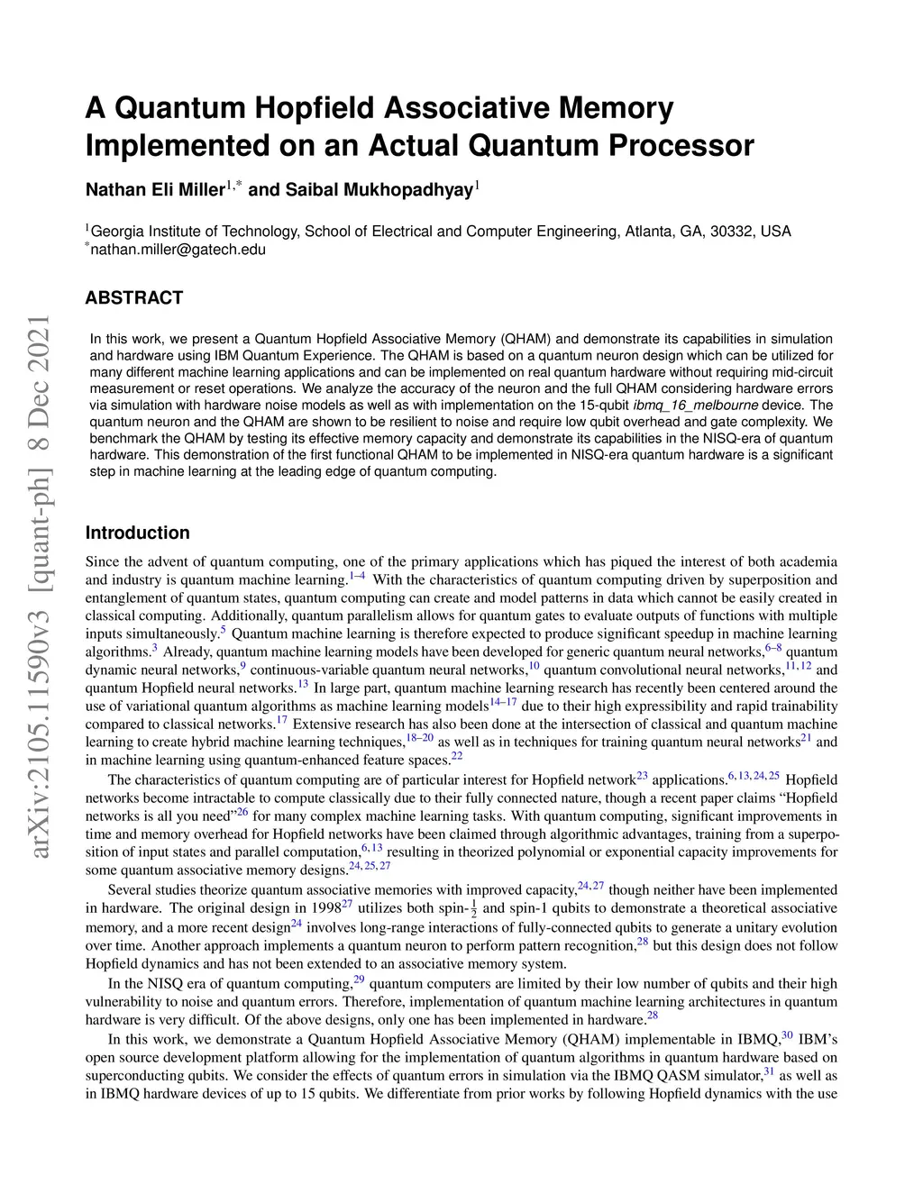 A Quantum Hopfield Associative Memory Implemented on an Actual Quantum