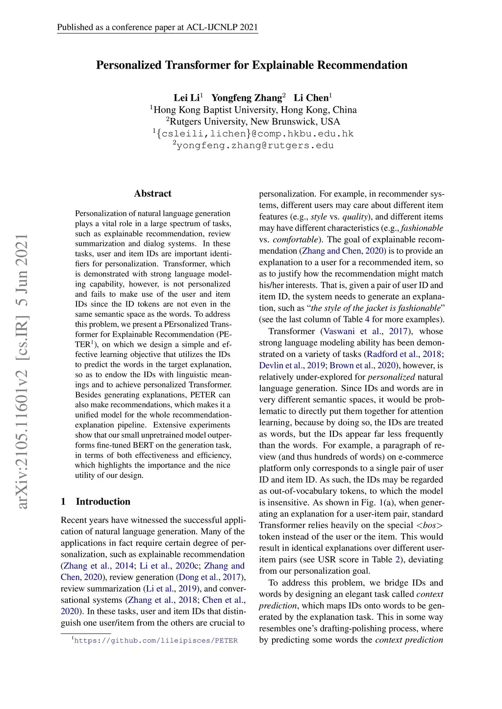 Personalization of natural language generation plays a vital role in a large spectrum of tasks, such as explainable recommendation, review summarization and dialog systems. In these tasks, user and item IDs are important identifiers for personalization. Transformer, which is demonstrated with strong language modeling capability, however, is not personalized and fails to make use of the user and item IDs since the ID tokens are not even in the same semantic space as the words. To address this problem, we present a PErsonalized Transformer for Explainable Recommendation (PETER), on which we design a simple and effective learning objective that utilizes the IDs to predict the words in the target explanation, so as to endow the IDs with linguistic meanings and to achieve personalized Transformer. Besides generating explanations, PETER can also make recommendations, which makes it a unified model for the whole recommendation-explanation pipeline. Extensive experiments show that our small unpretrained model outperforms fine-tuned BERT on the generation task, in terms of both effectiveness and efficiency, which highlights the importance and the nice utility of our design.