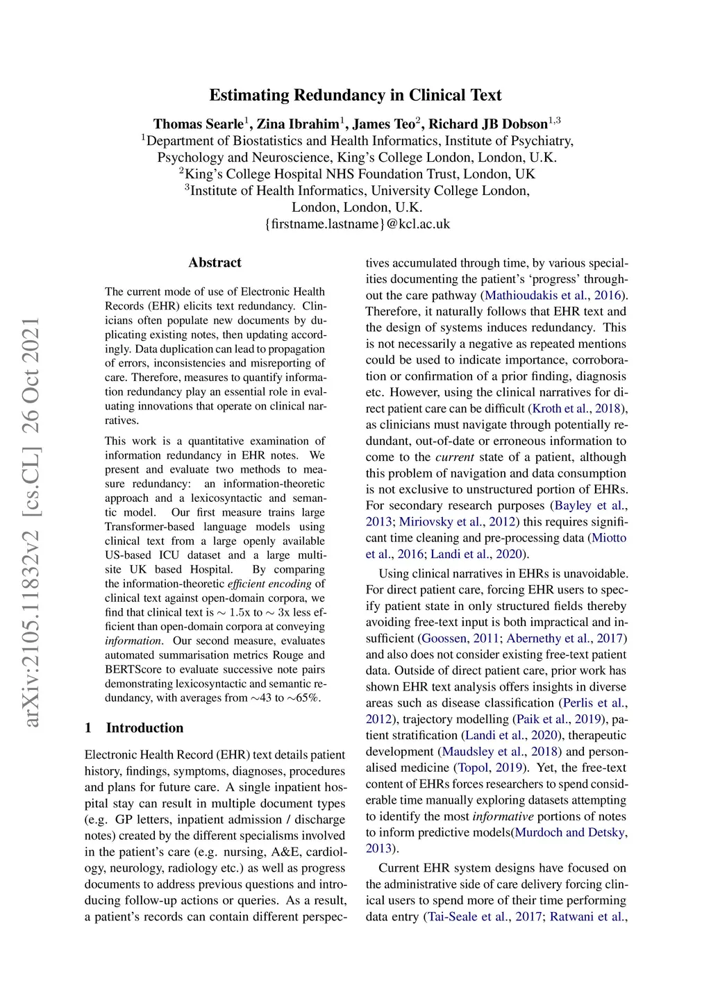 The current mode of use of Electronic Health Record (EHR) elicits text redundancy. Clinicians often populate new documents by duplicating existing notes, then updating accordingly. Data duplication can lead to a propagation of errors, inconsistencies and misreporting of care. Therefore, quantifying information redundancy can play an essential role in evaluating innovations that operate on clinical narratives. This work is a quantitative examination of information redundancy in EHR notes. We present and evaluate two strategies to measure redundancy: an information-theoretic approach and a lexicosyntactic and semantic model. We evaluate the measures by training large Transformer-based language models using clinical text from a large openly available US-based ICU dataset and a large multi-site UK based Trust. By comparing the information-theoretic content of the trained models with open-domain language models, the language models trained using clinical text have shown ~1.5x to ~3x less efficient than open-domain corpora. Manual evaluation shows a high correlation with lexicosyntactic and semantic redundancy, with averages ~43 to ~65%.