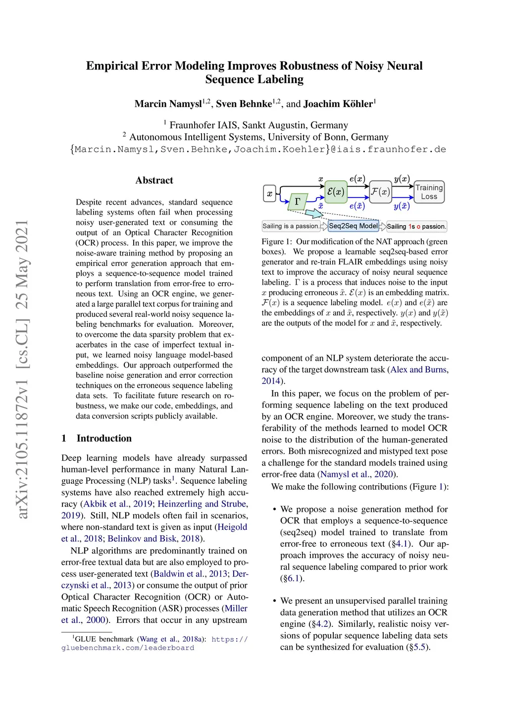 Despite recent advances, standard sequence labeling systems often fail when processing noisy user-generated text or consuming the output of an Optical Character Recognition (OCR) process. In this paper, we improve the noise-aware training method by proposing an empirical error generation approach that employs a sequence-to-sequence model trained to perform translation from error-free to erroneous text. Using an OCR engine, we generated a large parallel text corpus for training and produced several real-world noisy sequence labeling benchmarks for evaluation. Moreover, to overcome the data sparsity problem that exacerbates in the case of imperfect textual input, we learned noisy language model-based embeddings. Our approach outperformed the baseline noise generation and error correction techniques on the erroneous sequence labeling data sets. To facilitate future research on robustness, we make our code, embeddings, and data conversion scripts publicly available.