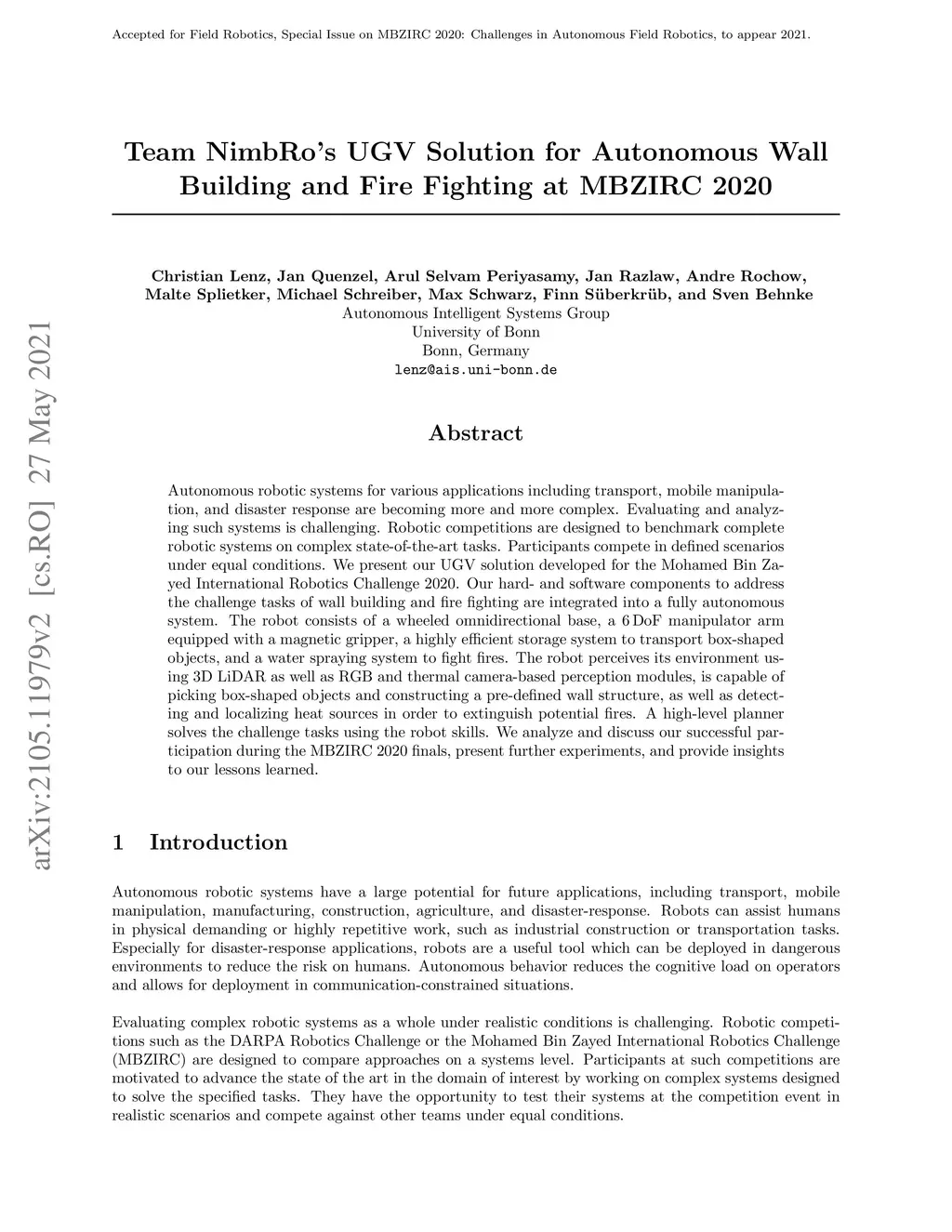 Autonomous robotic systems for various applications including transport, mobile manipulation, and disaster response are becoming more and more complex. Evaluating and analyzing such systems is challenging. Robotic competitions are designed to benchmark complete robotic systems on complex state-of-the-art tasks. Participants compete in defined scenarios under equal conditions. We present our UGV solution developed for the Mohamed Bin Zayed International Robotics Challenge 2020. Our hard- and software components to address the challenge tasks of wall building and fire fighting are integrated into a fully autonomous system. The robot consists of a wheeled omnidirectional base, a 6 DoF manipulator arm equipped with a magnetic gripper, a highly efficient storage system to transport box-shaped objects, and a water spraying system to fight fires. The robot perceives its environment using 3D LiDAR as well as RGB and thermal camera-based perception modules, is capable of picking box-shaped objects and constructing a pre-defined wall structure, as well as detecting and localizing heat sources in order to extinguish potential fires. A high-level planner solves the challenge tasks using the robot skills. We analyze and discuss our successful participation during the MBZIRC 2020 finals, present further experiments, and provide insights to our lessons learned.