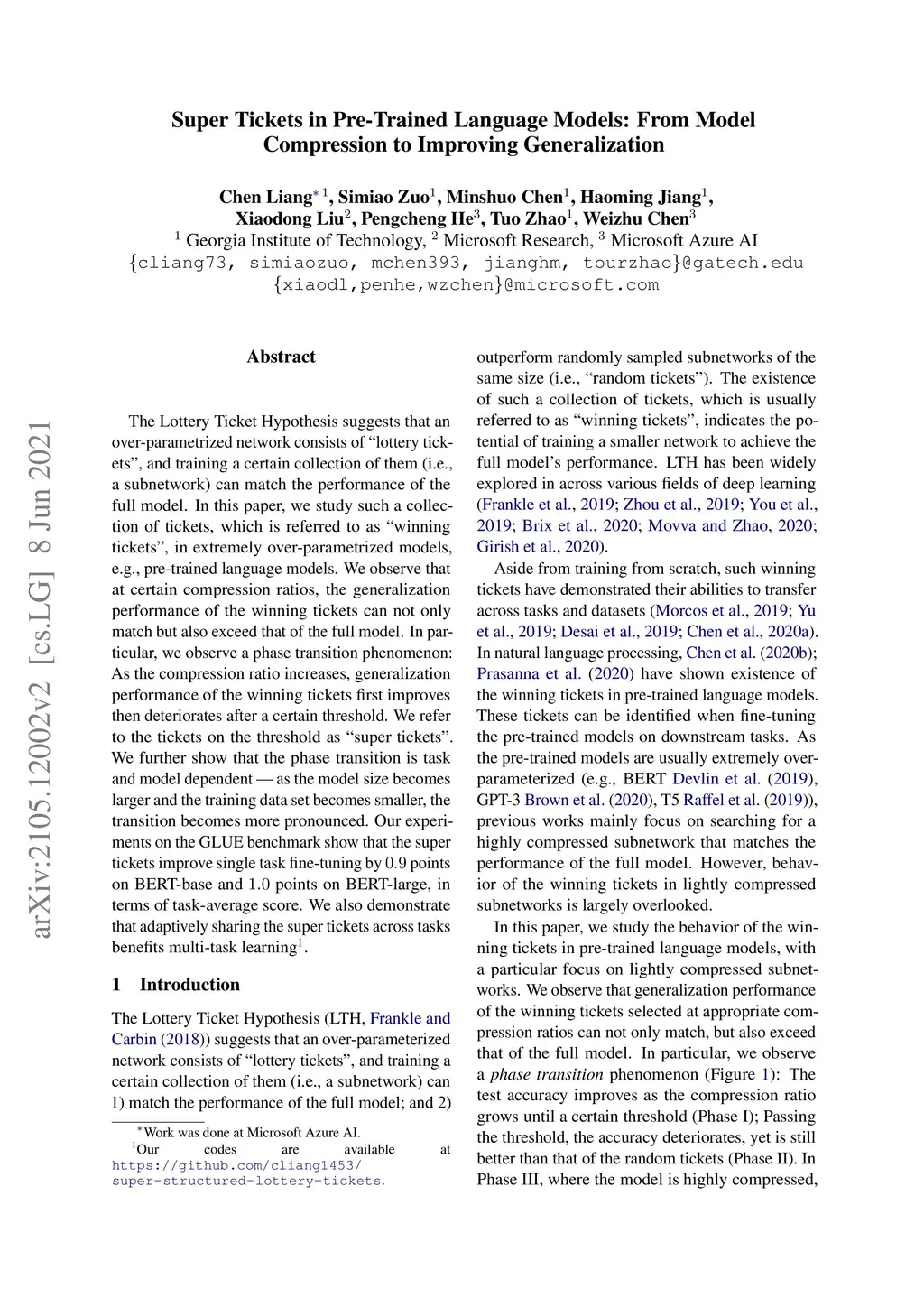 The Lottery Ticket Hypothesis suggests that an over-parametrized network consists of ``lottery tickets'', and training a certain collection of them (i.e., a subnetwork) can match the performance of the full model. In this paper, we study such a collection of tickets, which is referred to as ``winning tickets'', in extremely over-parametrized models, e.g., pre-trained language models. We observe that at certain compression ratios, the generalization performance of the winning tickets can not only match but also exceed that of the full model. In particular, we observe a phase transition phenomenon: As the compression ratio increases, generalization performance of the winning tickets first improves then deteriorates after a certain threshold. We refer to the tickets on the threshold as ``super tickets''. We further show that the phase transition is task and model dependent -- as the model size becomes larger and the training data set becomes smaller, the transition becomes more pronounced. Our experiments on the GLUE benchmark show that the super tickets improve single task fine-tuning by points on BERT-base and points on BERT-large, in terms of task-average score. We also demonstrate that adaptively sharing the super tickets across tasks benefits multi-task learning.