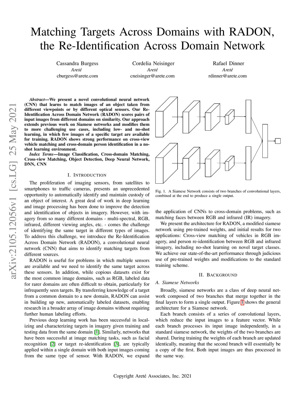 We present a novel convolutional neural network that learns to match images of an object taken from different viewpoints or by different optical sensors. Our Re-Identification Across Domain Network (RADON) scores pairs of input images from different domains on similarity. Our approach extends previous work on Siamese networks and modifies them to more challenging use cases, including low- and no-shot learning, in which few images of a specific target are available for training. RADON shows strong performance on cross-view vehicle matching and cross-domain person identification in a no-shot learning environment.