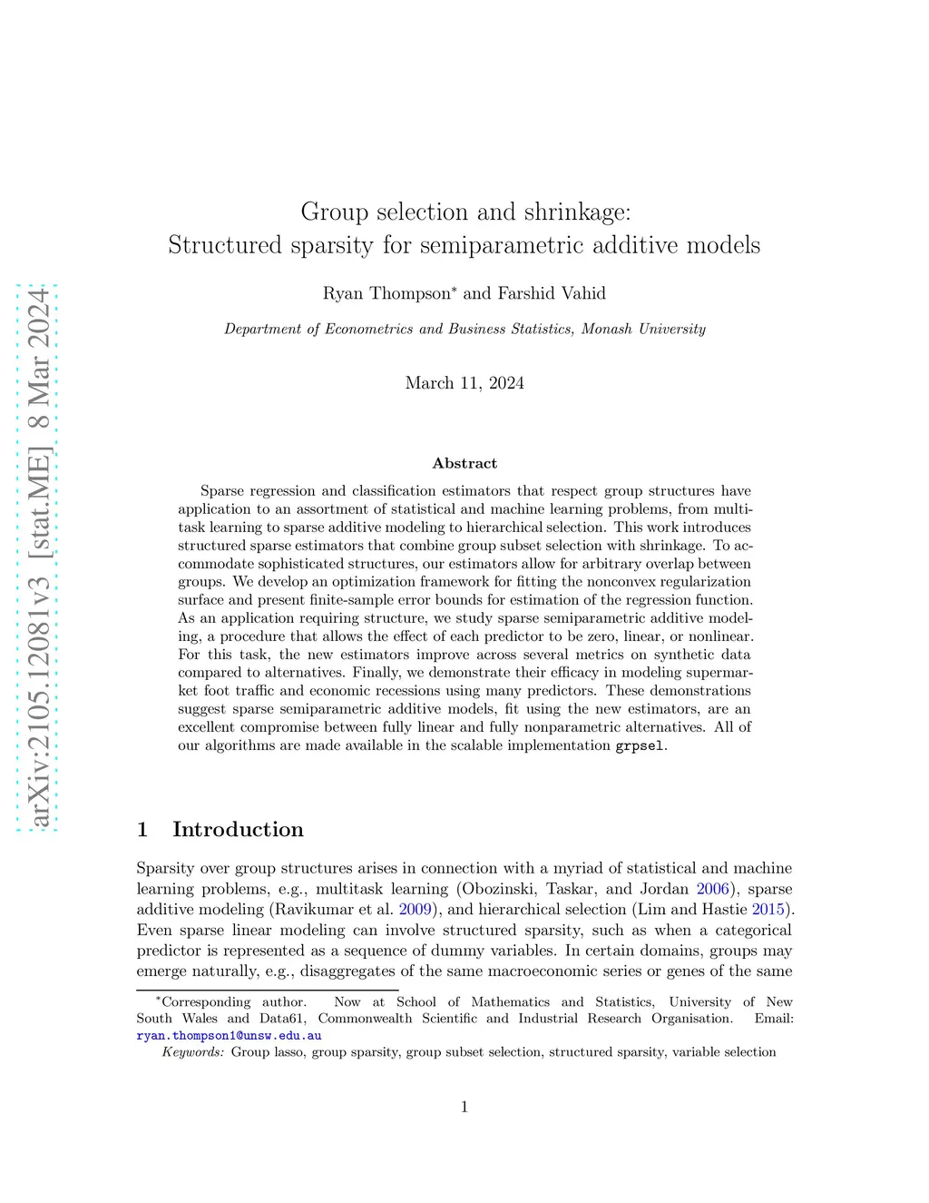 Sparse regression and classification estimators that respect group structures have application to an assortment of statistical and machine learning problems, from multitask learning to sparse additive modeling to hierarchical selection. This work introduces structured sparse estimators that combine group subset selection with shrinkage. To accommodate sophisticated structures, our estimators allow for arbitrary overlap between groups. We develop an optimization framework for fitting the nonconvex regularization surface and present finite-sample error bounds for estimation of the regression function. As an application requiring structure, we study sparse semiparametric modeling, a procedure that allows the effect of each predictor to be zero, linear, or nonlinear. For this task, the new estimators improve across several metrics on synthetic data compared to alternatives. Finally, we demonstrate their efficacy in modeling supermarket foot traffic and economic recessions using many predictors. These demonstrations suggest sparse semiparametric models, fit using the new estimators, are an excellent compromise between fully linear and fully nonparametric alternatives. All of our algorithms are made available in the scalable implementation grpsel.