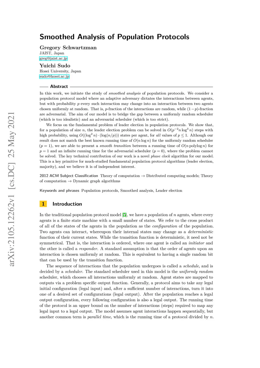 In this work, we initiate the study of \emph{smoothed analysis} of population protocols. We consider a population protocol model where an adaptive adversary dictates the interactions between agents, but with probability every such interaction may change into an interaction between two agents chosen uniformly at random. That is, -fraction of the interactions are random, while -fraction are adversarial. The aim of our model is to bridge the gap between a uniformly random scheduler (which is too idealistic) and an adversarial scheduler (which is too strict). We focus on the fundamental problem of leader election in population protocols. We show that, for a population of size , the leader election problem can be solved in steps with high probability, using states per agent, for \emph{all} values of . Although our result does not match the best known running time of for the uniformly random scheduler (), we are able to present a \emph{smooth transition} between a running time of for and an infinite running time for the adversarial scheduler (), where the problem cannot be solved. The key technical contribution of our work is a novel \emph{phase clock} algorithm for our model. This is a key primitive for much-studied fundamental population protocol algorithms (leader election, majority), and we believe it is of independent interest.