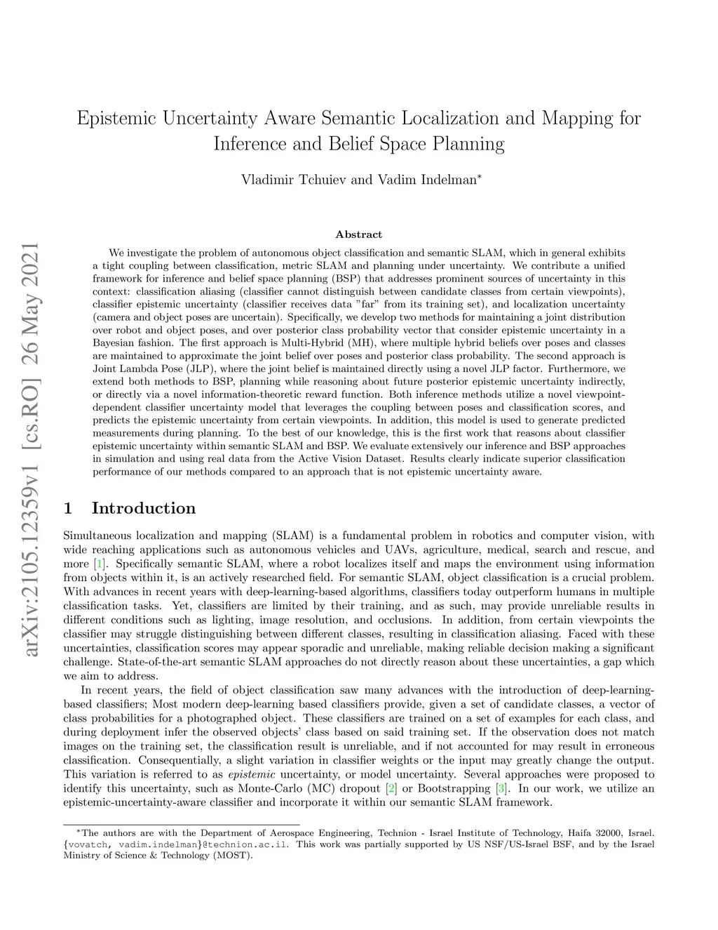 We investigate the problem of autonomous object classification and semantic SLAM, which in general exhibits a tight coupling between classification, metric SLAM and planning under uncertainty. We contribute a unified framework for inference and belief space planning (BSP) that addresses prominent sources of uncertainty in this context: classification aliasing (classier cannot distinguish between candidate classes from certain viewpoints), classifier epistemic uncertainty (classifier receives data "far" from its training set), and localization uncertainty (camera and object poses are uncertain). Specifically, we develop two methods for maintaining a joint distribution over robot and object poses, and over posterior class probability vector that considers epistemic uncertainty in a Bayesian fashion. The first approach is Multi-Hybrid (MH), where multiple hybrid beliefs over poses and classes are maintained to approximate the joint belief over poses and posterior class probability. The second approach is Joint Lambda Pose (JLP), where the joint belief is maintained directly using a novel JLP factor. Furthermore, we extend both methods to BSP, planning while reasoning about future posterior epistemic uncertainty indirectly, or directly via a novel information-theoretic reward function. Both inference methods utilize a novel viewpoint-dependent classifier uncertainty model that leverages the coupling between poses and classification scores and predicts the epistemic uncertainty from certain viewpoints. In addition, this model is used to generate predicted measurements during planning. To the best of our knowledge, this is the first work that reasons about classifier epistemic uncertainty within semantic SLAM and BSP.