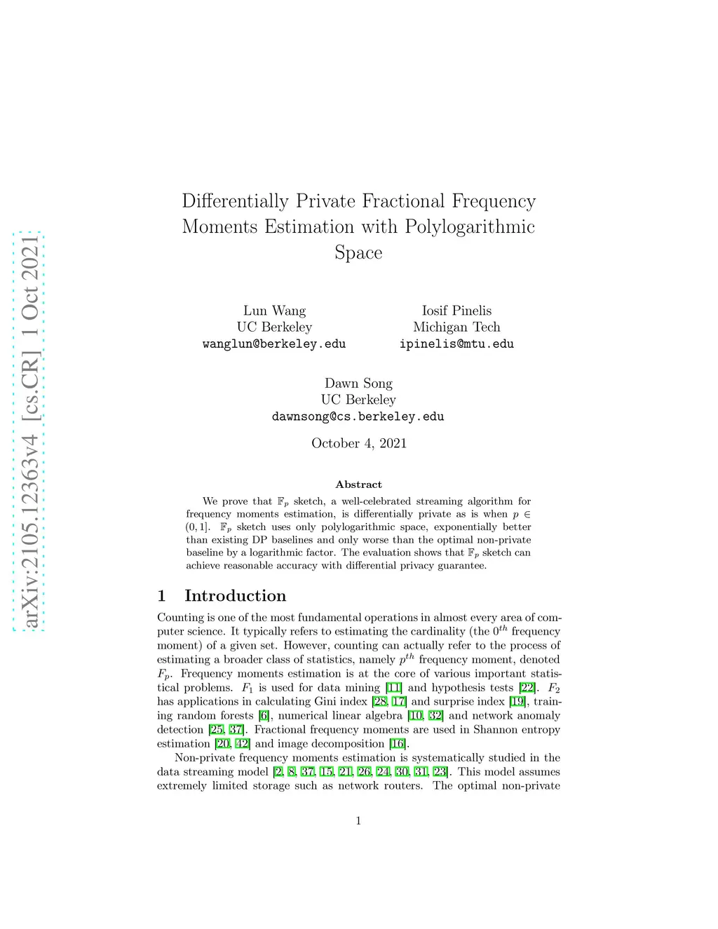 We prove that sketch, a well-celebrated streaming algorithm for frequency moments estimation, is differentially private as is when . sketch uses only polylogarithmic space, exponentially better than existing DP baselines and only worse than the optimal non-private baseline by a logarithmic factor. The evaluation shows that sketch can achieve reasonable accuracy with strong privacy guarantees.