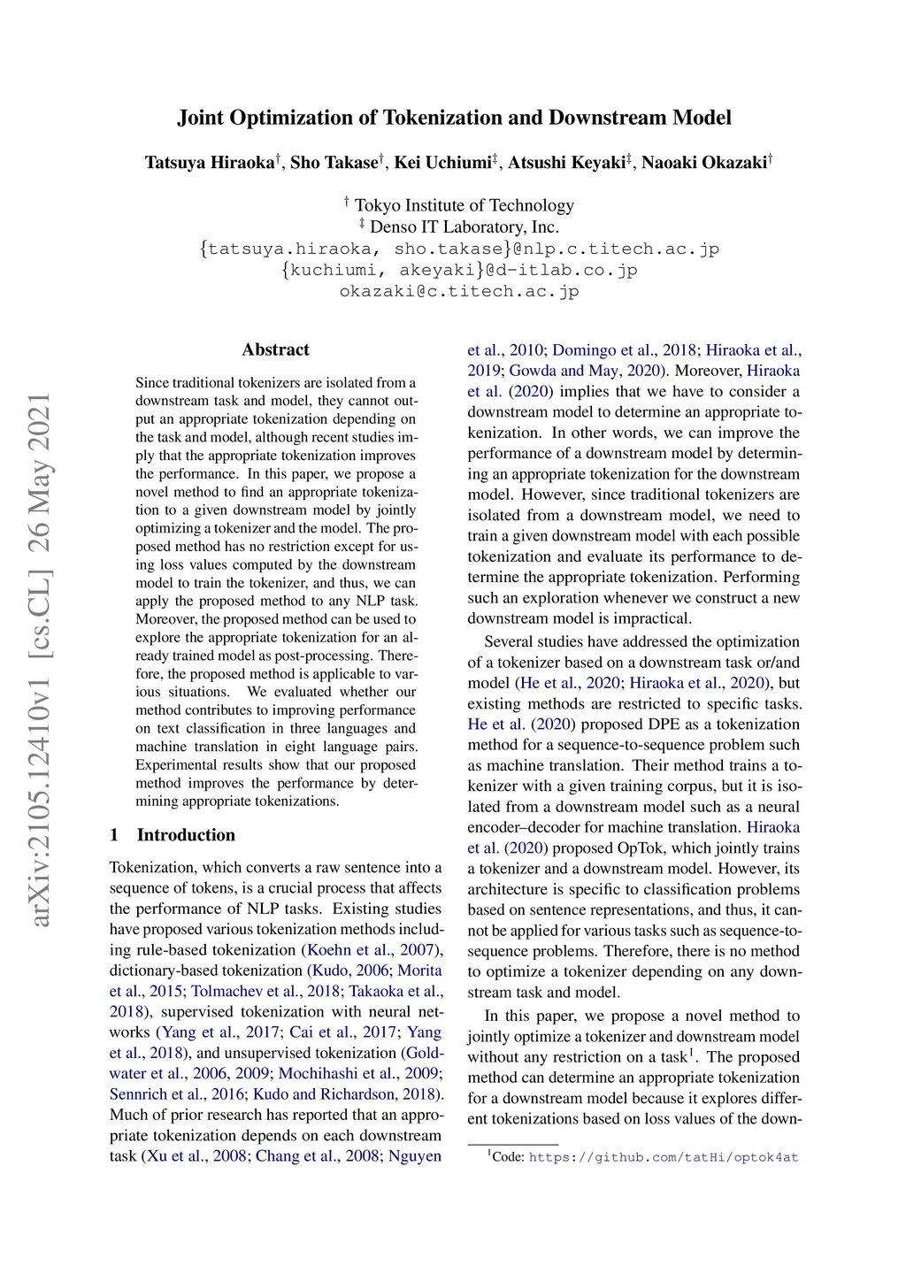 Since traditional tokenizers are isolated from a downstream task and model, they cannot output an appropriate tokenization depending on the task and model, although recent studies imply that the appropriate tokenization improves the performance. In this paper, we propose a novel method to find an appropriate tokenization to a given downstream model by jointly optimizing a tokenizer and the model. The proposed method has no restriction except for using loss values computed by the downstream model to train the tokenizer, and thus, we can apply the proposed method to any NLP task. Moreover, the proposed method can be used to explore the appropriate tokenization for an already trained model as post-processing. Therefore, the proposed method is applicable to various situations. We evaluated whether our method contributes to improving performance on text classification in three languages and machine translation in eight language pairs. Experimental results show that our proposed method improves the performance by determining appropriate tokenizations.