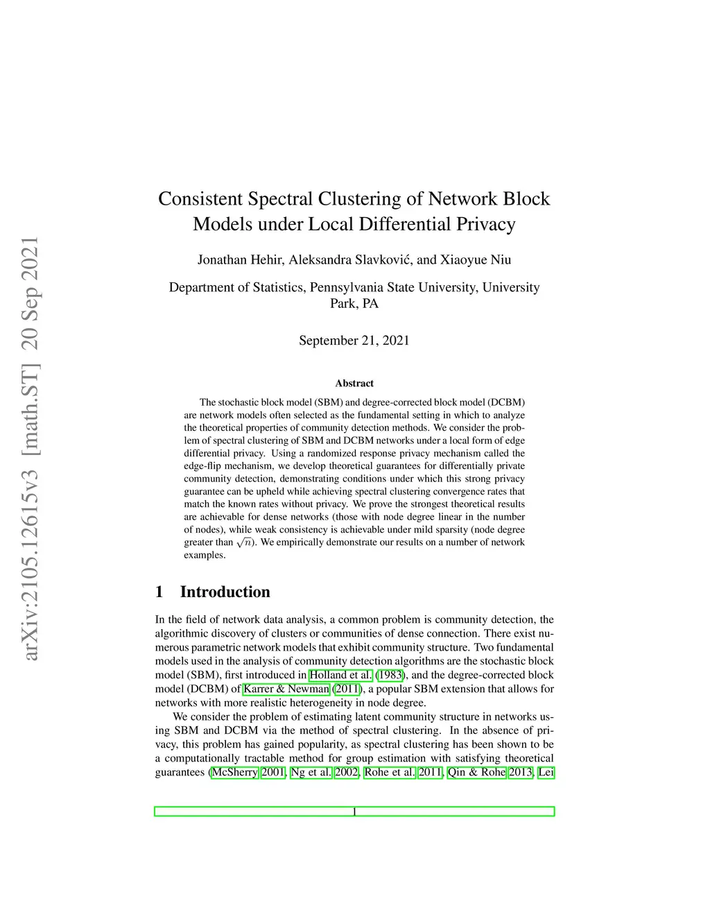 The stochastic block model (SBM) and degree-corrected block model (DCBM) are network models often selected as the fundamental setting in which to analyze the theoretical properties of community detection methods. We consider the problem of spectral clustering of SBM and DCBM networks under a local form of edge differential privacy. Using a randomized response privacy mechanism called the edge-flip mechanism, we develop theoretical guarantees for differentially private community detection, demonstrating conditions under which this strong privacy guarantee can be upheld while achieving spectral clustering convergence rates that match the known rates without privacy. We prove the strongest theoretical results are achievable for dense networks (those with node degree linear in the number of nodes), while weak consistency is achievable under mild sparsity (node degree greater than ). We empirically demonstrate our results on a number of network examples.