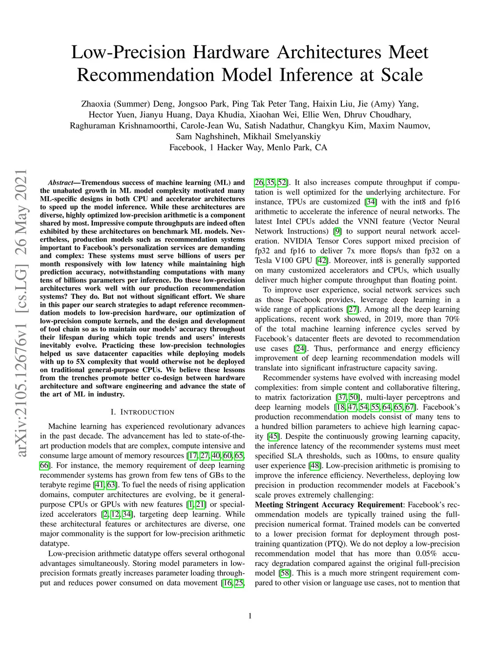 Tremendous success of machine learning (ML) and the unabated growth in ML model complexity motivated many ML-specific designs in both CPU and accelerator architectures to speed up the model inference. While these architectures are diverse, highly optimized low-precision arithmetic is a component shared by most. Impressive compute throughputs are indeed often exhibited by these architectures on benchmark ML models. Nevertheless, production models such as recommendation systems important to Facebook's personalization services are demanding and complex: These systems must serve billions of users per month responsively with low latency while maintaining high prediction accuracy, notwithstanding computations with many tens of billions parameters per inference. Do these low-precision architectures work well with our production recommendation systems? They do. But not without significant effort. We share in this paper our search strategies to adapt reference recommendation models to low-precision hardware, our optimization of low-precision compute kernels, and the design and development of tool chain so as to maintain our models' accuracy throughout their lifespan during which topic trends and users' interests inevitably evolve. Practicing these low-precision technologies helped us save datacenter capacities while deploying models with up to 5X complexity that would otherwise not be deployed on traditional general-purpose CPUs. We believe these lessons from the trenches promote better co-design between hardware architecture and software engineering and advance the state of the art of ML in industry.