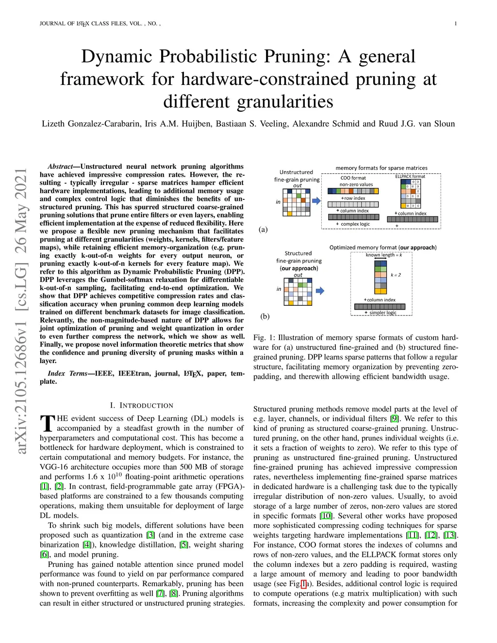 Unstructured neural network pruning algorithms have achieved impressive compression rates. However, the resulting - typically irregular - sparse matrices hamper efficient hardware implementations, leading to additional memory usage and complex control logic that diminishes the benefits of unstructured pruning. This has spurred structured coarse-grained pruning solutions that prune entire filters or even layers, enabling efficient implementation at the expense of reduced flexibility. Here we propose a flexible new pruning mechanism that facilitates pruning at different granularities (weights, kernels, filters/feature maps), while retaining efficient memory organization (e.g. pruning exactly k-out-of-n weights for every output neuron, or pruning exactly k-out-of-n kernels for every feature map). We refer to this algorithm as Dynamic Probabilistic Pruning (DPP). DPP leverages the Gumbel-softmax relaxation for differentiable k-out-of-n sampling, facilitating end-to-end optimization. We show that DPP achieves competitive compression rates and classification accuracy when pruning common deep learning models trained on different benchmark datasets for image classification. Relevantly, the non-magnitude-based nature of DPP allows for joint optimization of pruning and weight quantization in order to even further compress the network, which we show as well. Finally, we propose novel information theoretic metrics that show the confidence and pruning diversity of pruning masks within a layer.