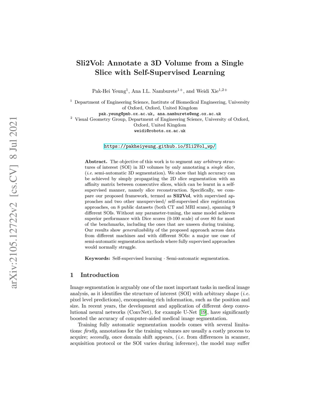The objective of this work is to segment any arbitrary structures of interest (SOI) in 3D volumes by only annotating a single slice, (i.e. semi-automatic 3D segmentation). We show that high accuracy can be achieved by simply propagating the 2D slice segmentation with an affinity matrix between consecutive slices, which can be learnt in a self-supervised manner, namely slice reconstruction. Specifically, we compare the proposed framework, termed as Sli2Vol, with supervised approaches and two other unsupervised/ self-supervised slice registration approaches, on 8 public datasets (both CT and MRI scans), spanning 9 different SOIs. Without any parameter-tuning, the same model achieves superior performance with Dice scores (0-100 scale) of over 80 for most of the benchmarks, including the ones that are unseen during training. Our results show generalizability of the proposed approach across data from different machines and with different SOIs: a major use case of semi-automatic segmentation methods where fully supervised approaches would normally struggle. The source code will be made publicly available at https://github.com/pakheiyeung/Sli2Vol.
